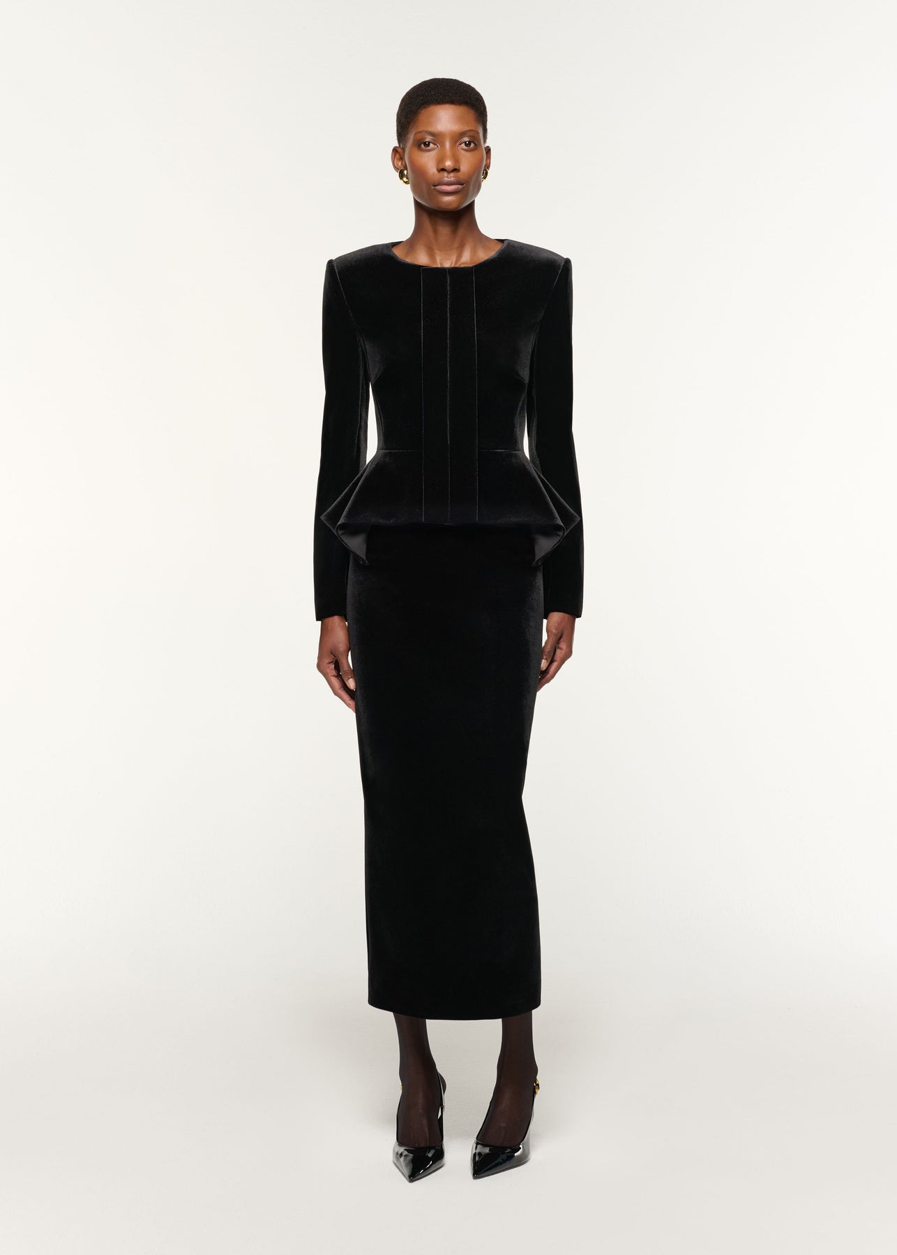 long-sleeve velvet midi dress with sculpted peplum – NOIRÉ