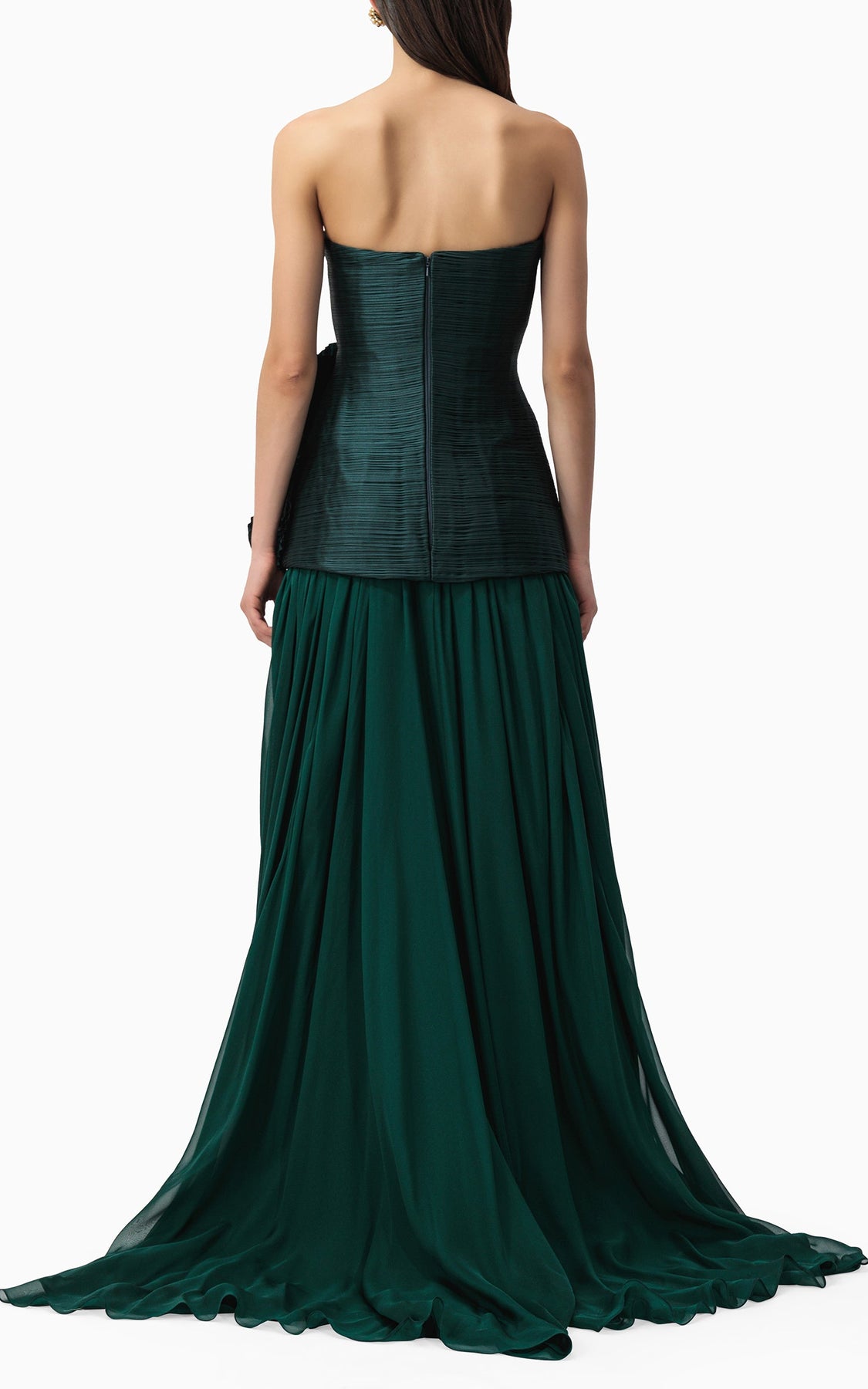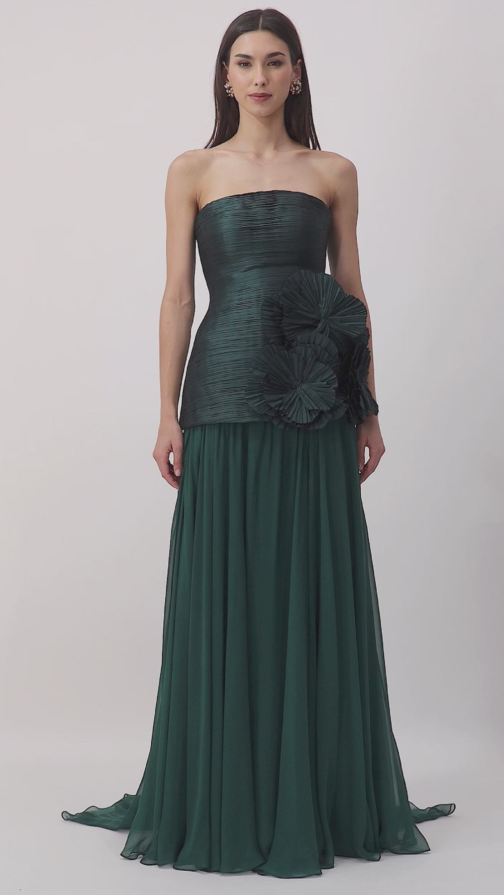 strapless pleated gown with oversized floral appliqués – EMERALD