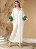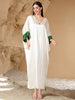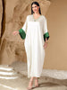 An elegant white dress with wide, flowing sleeves and attractive contrasting green cuffs. Featuring a relaxed fit, a V-neckline, and delicate embroideries, it blends sophistication with modern charm.