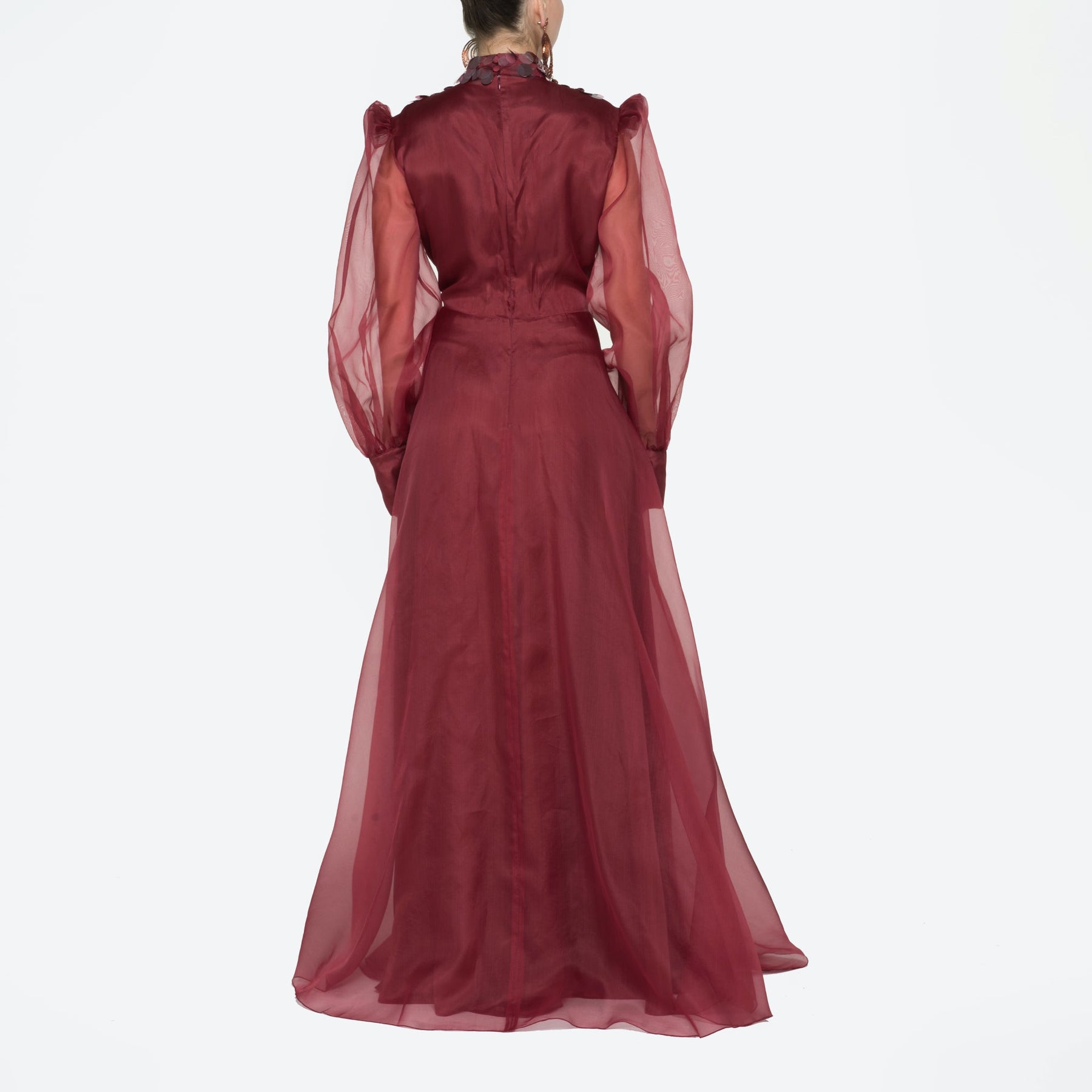 A romantic burgundy gown crafted from sheer organza, featuring voluminous sleeves and an elegant flowing skirt. The statement sequin yoke adds a dramatic shimmer, beautifully catching the light with every movement. A standout piece for evening occasions that blends sophistication with artistic glamour.