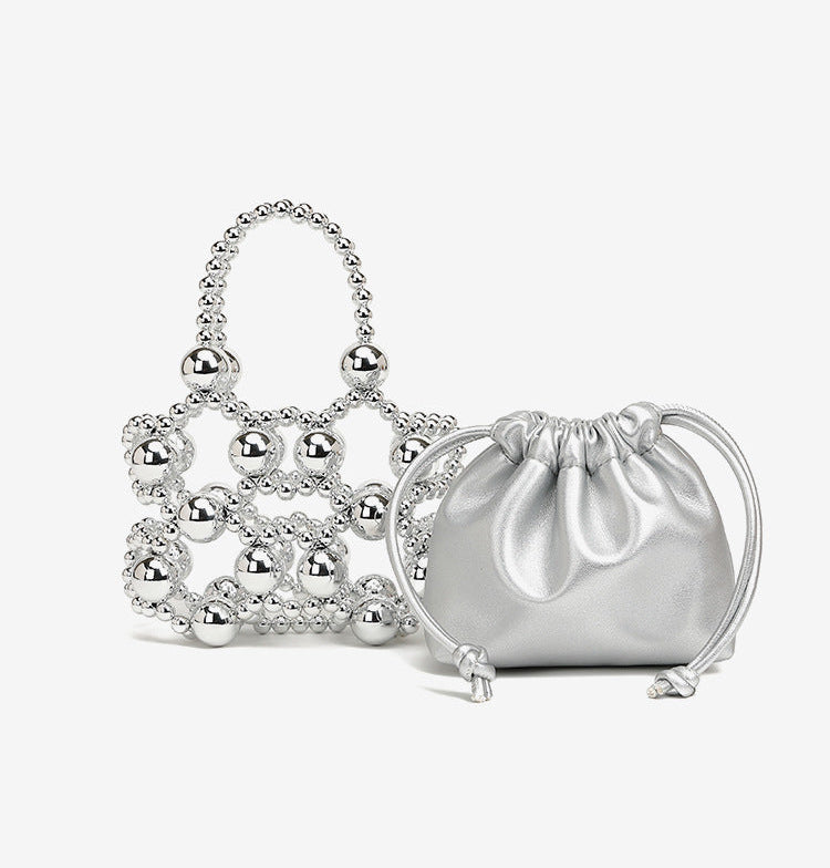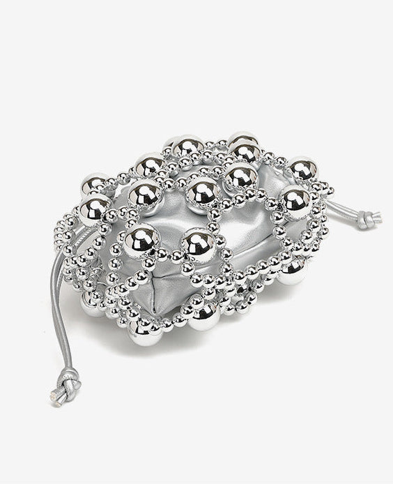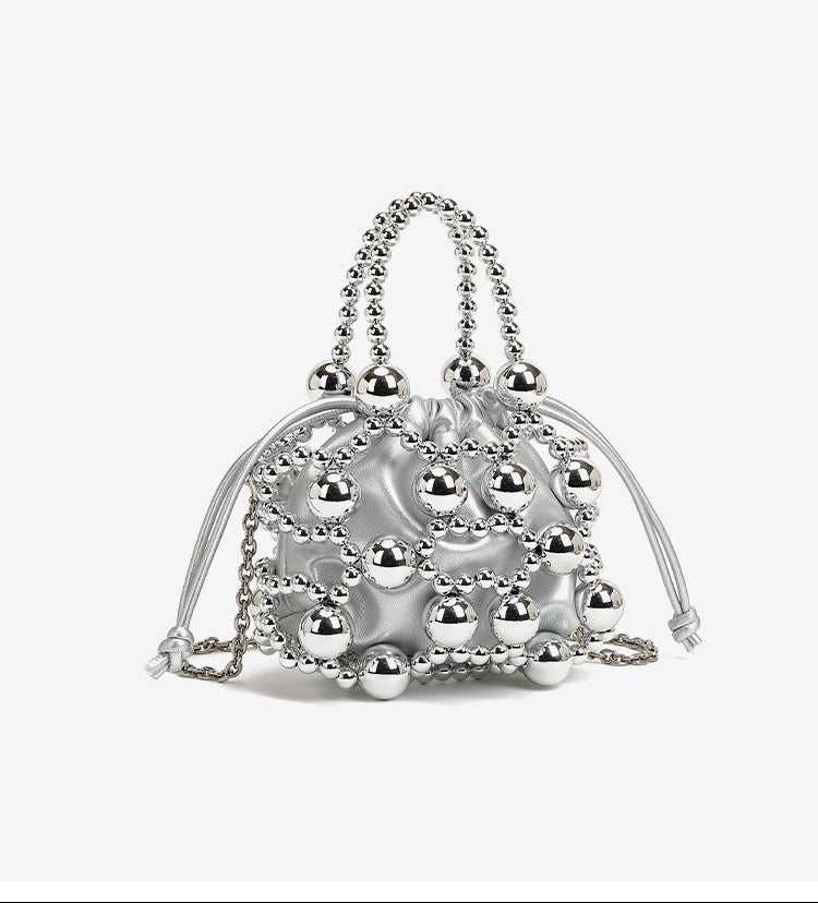 An elegant mini bag with shiny beaded details and a drawstring closure. Its intricate pearl handle and polished finish make it the perfect stylish accessory.
