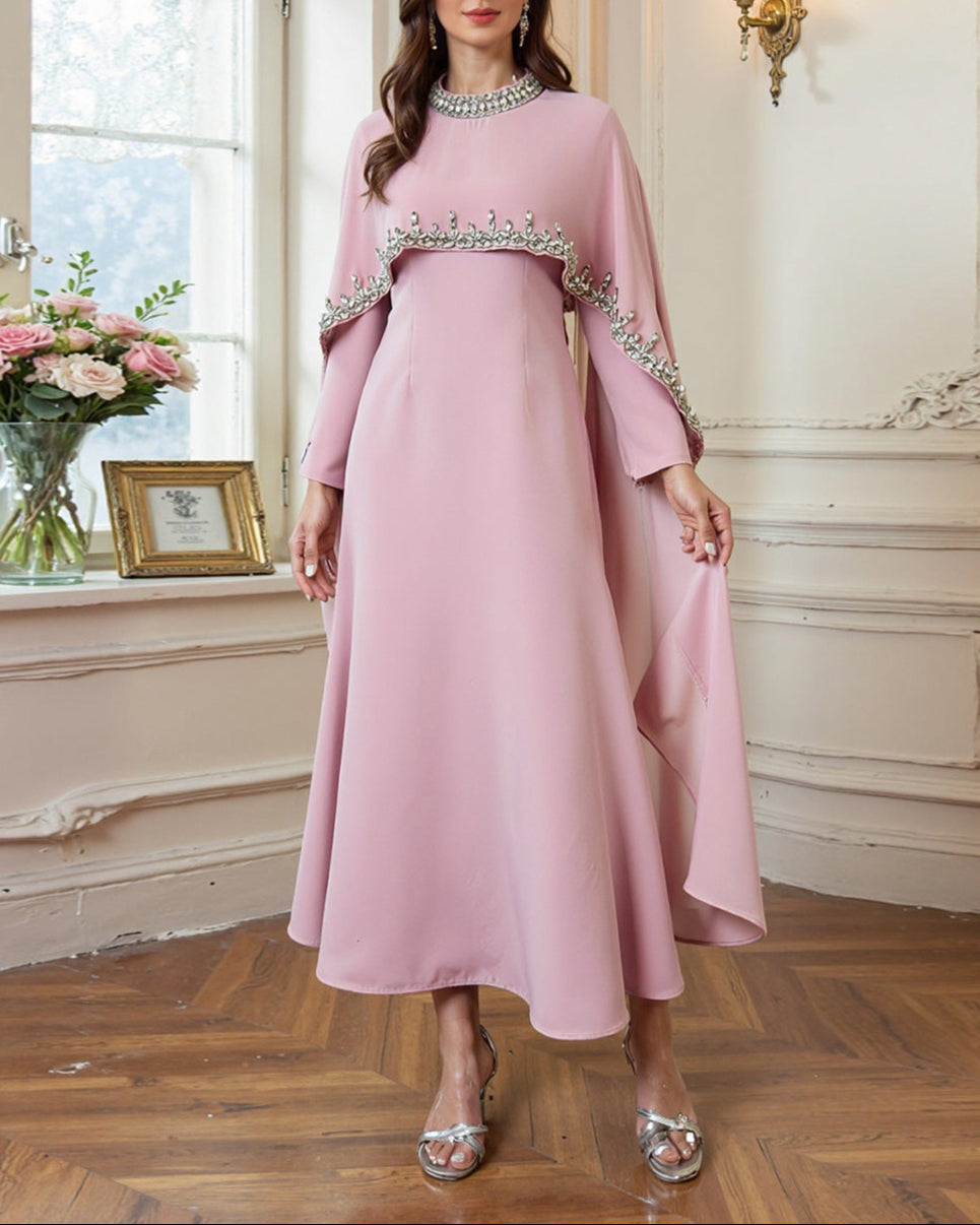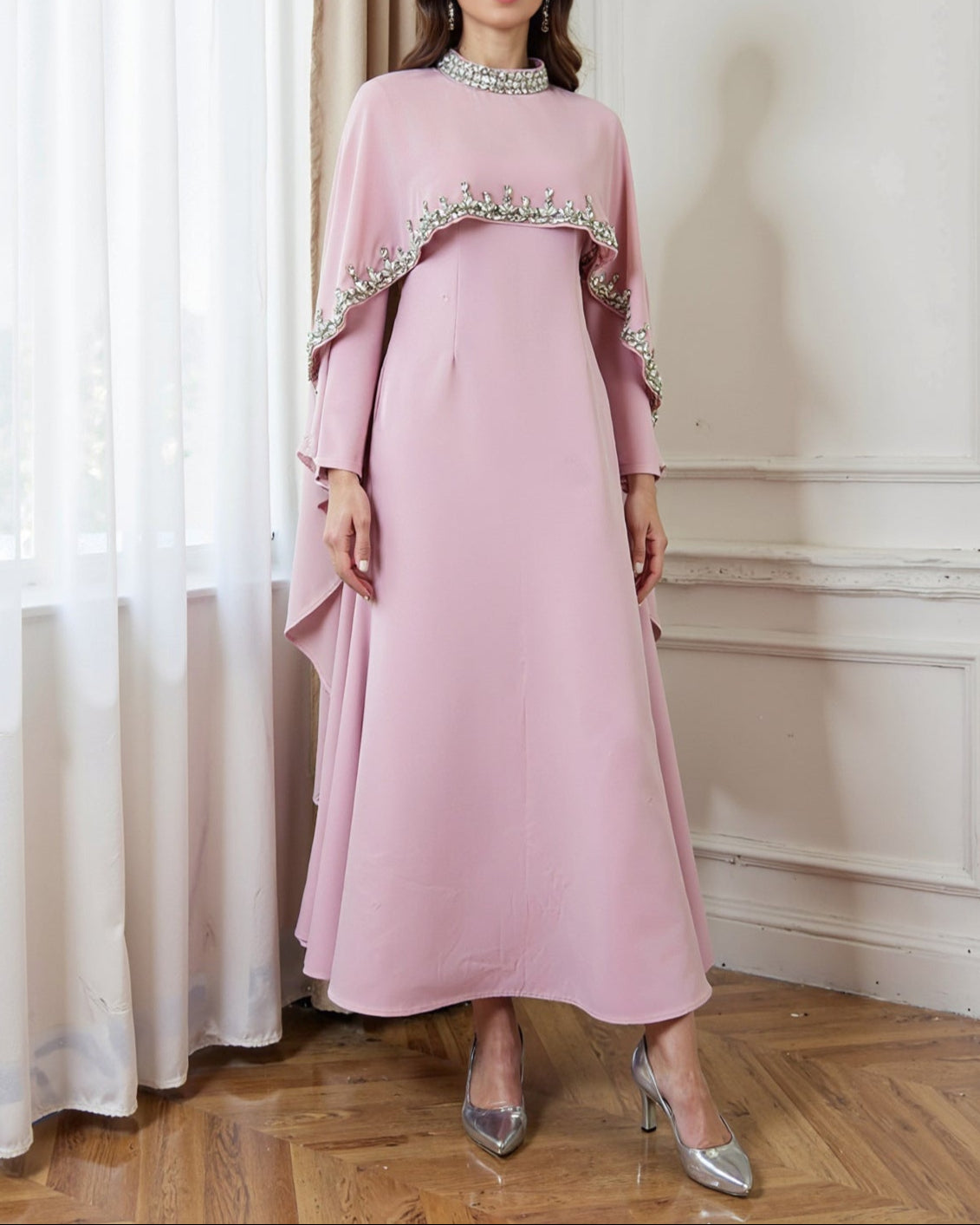 An elegant light pink dress featuring a wide, flared cut and a crystal-embellished headpiece. The high neck and sophisticated details add a timeless touch. Fabric name: Polyester Size Bust (cm) Length (cm) Sleeve (cm) S 106 140 61 M 110 141 61 L 116 142 62 XL 122 143 62