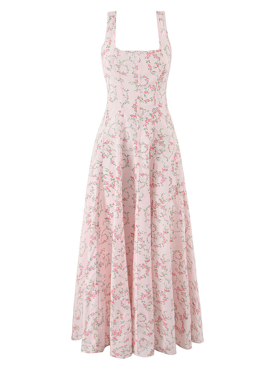 Soft pink sleeveless dress with delicate floral print, featuring a fitted bodice and a flowing, flared skirt for a graceful, feminine silhouette. Fabric name: polyester and cotton Size Bust (cm) Waist (cm) Hip (cm) Length (cm) Xs 86 72 100 112 S 90 76 104 113 M 94 80 108 114