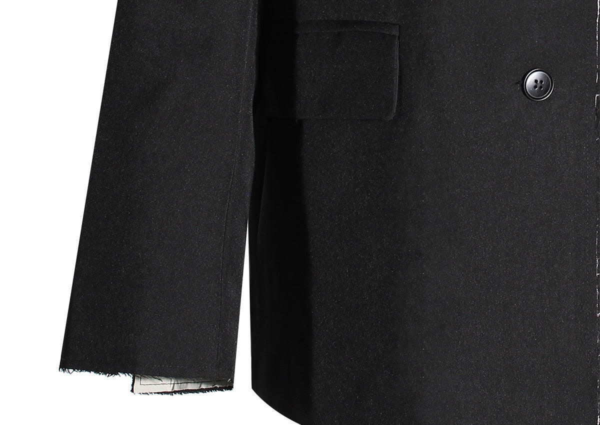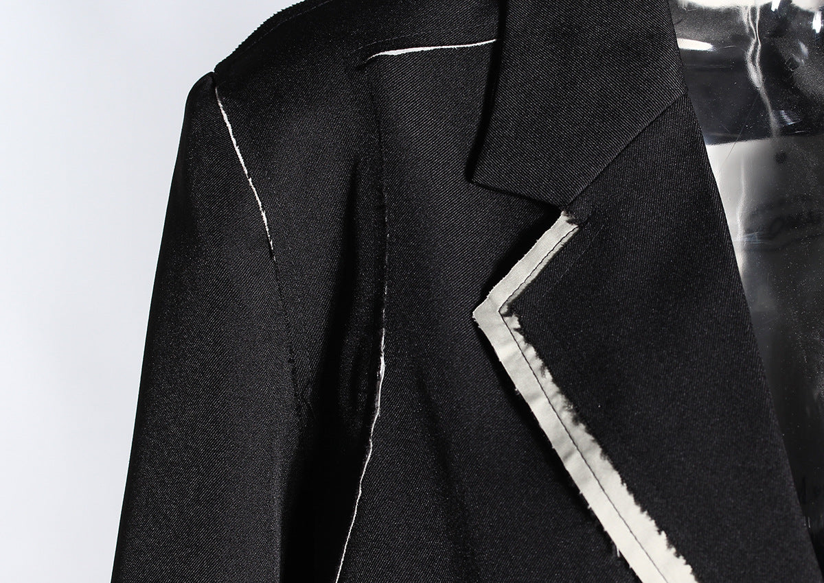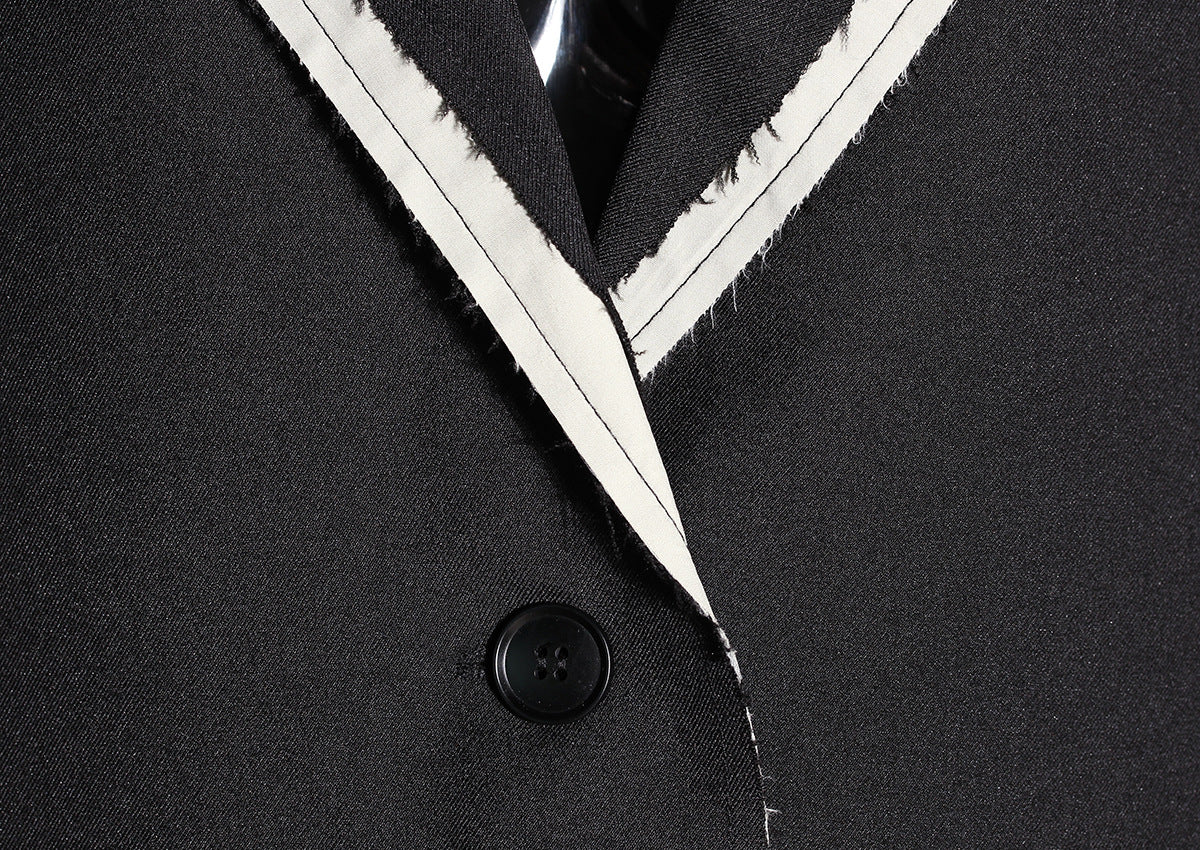 Sophisticated black blazer designed with clean tailored lines and sharp white contrast trim along the lapels for a modern twist. Features structured shoulders, dual front pockets, and a classic two-button closure—perfect for refined day-to-night looks.