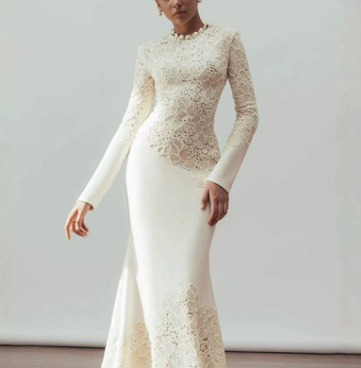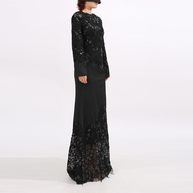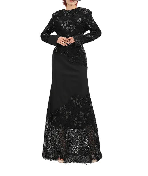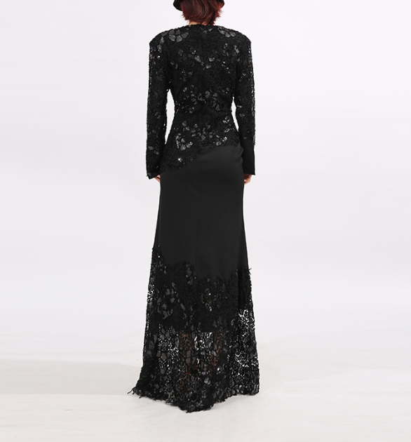 Sophisticated black maxi dress featuring intricate lace detailing across the bodice and hem, contrasted with smooth satin panels for a refined silhouette. Elegant and timeless, this statement piece is designed for formal evenings, galas, and elevated special occasions.