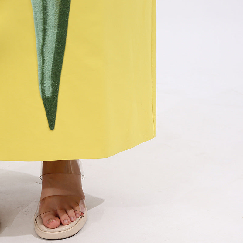 A striking strapless maxi dress crafted in a vibrant yellow hue, featuring elegant hand-embroidered floral motifs that cascade vertically for a flattering, elongated silhouette. Designed with a clean column cut, this piece highlights the shoulders and neckline while offering a refined, sculpted fit. Perfect for summer evenings, resort events, or standout occasions where effortless elegance meets artistic detail.