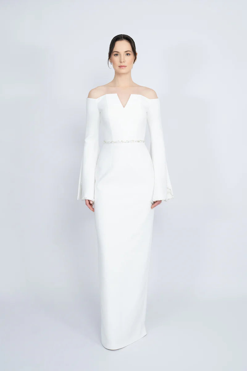 off-shoulder column gown with flared embellished sleeves – IVORYE
