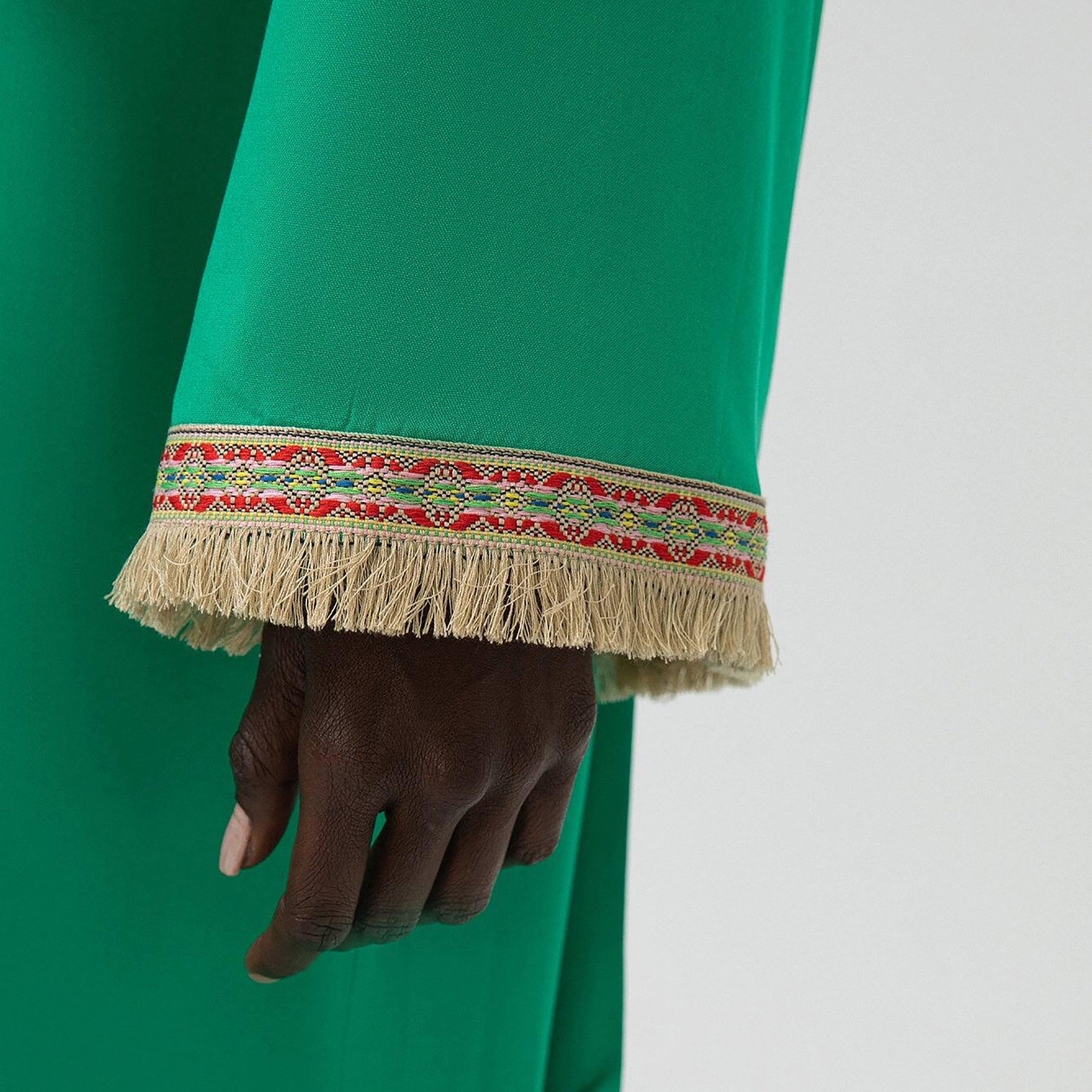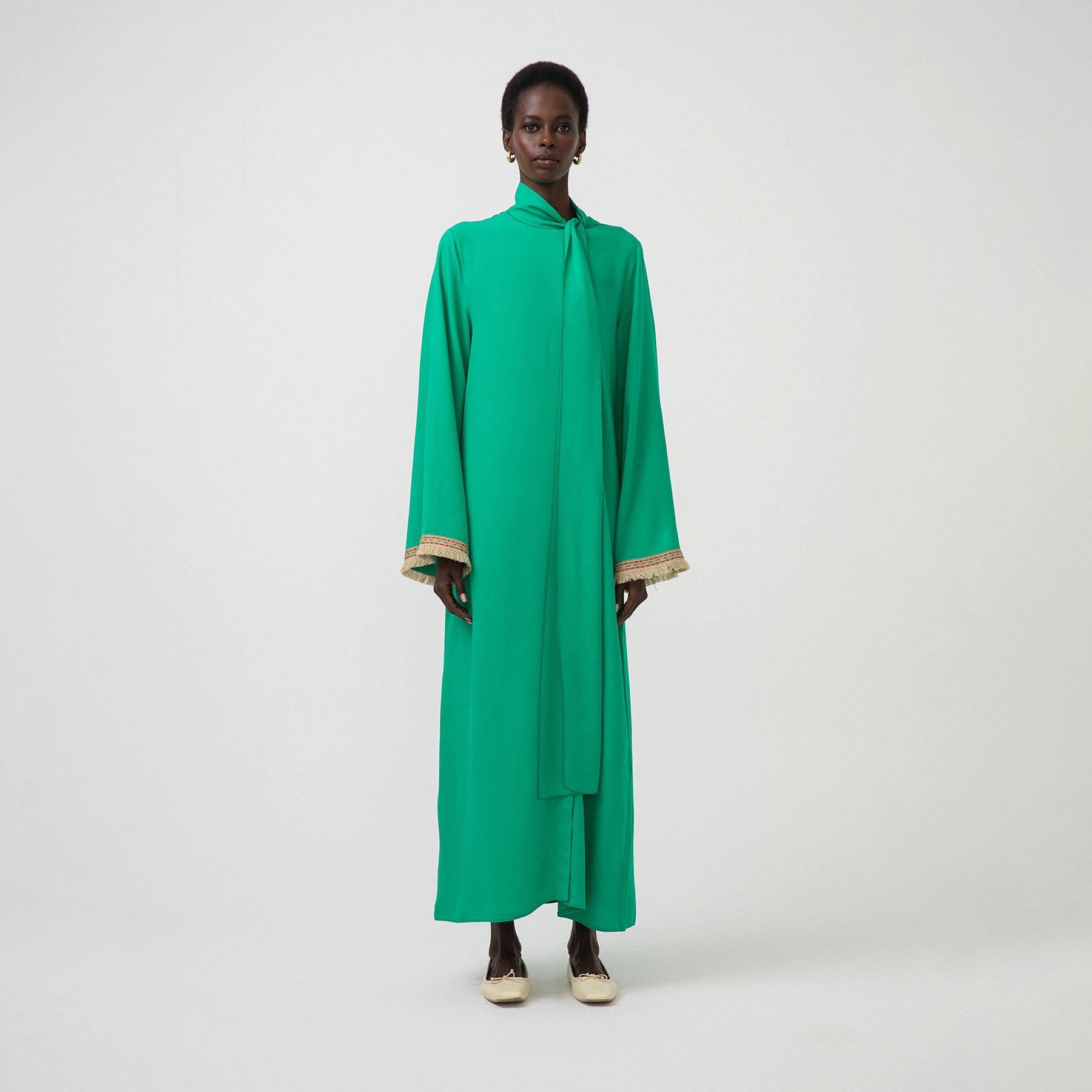 Flowing emerald-green kaftan featuring wide sleeves with intricate gold embellishments and a soft neck tie detail. A refined piece that balances modern simplicity with regal elegance.