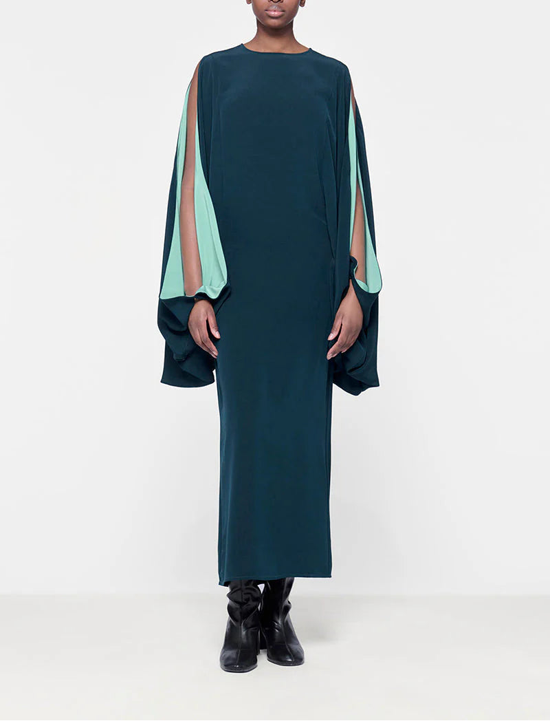 A contemporary teal gown featuring fluid cape sleeves with soft mint contrast lining and elegant open slits along the arms. Designed in a straight silhouette, it blends minimalism with dramatic movement for a refined, modern evening statement.