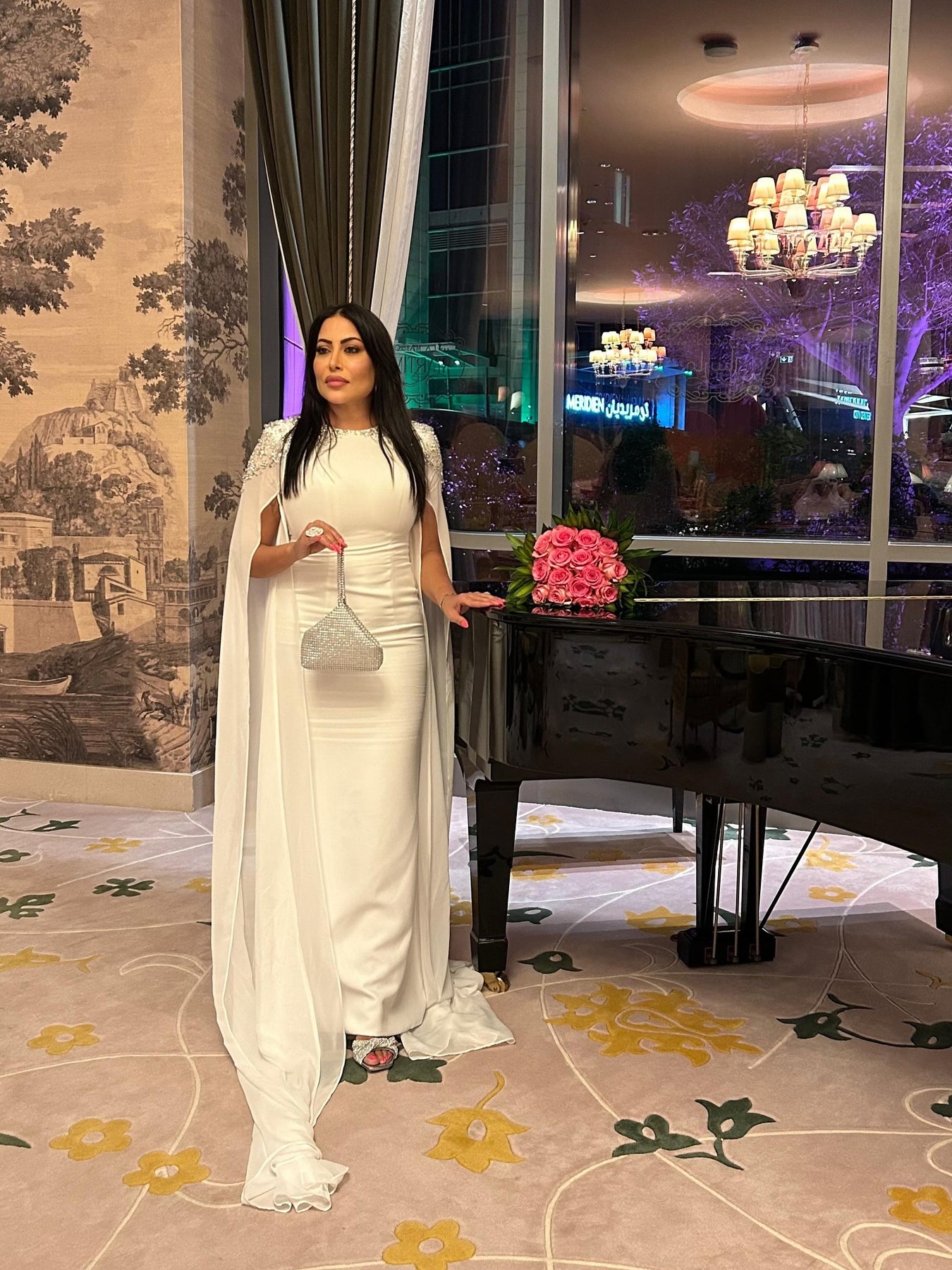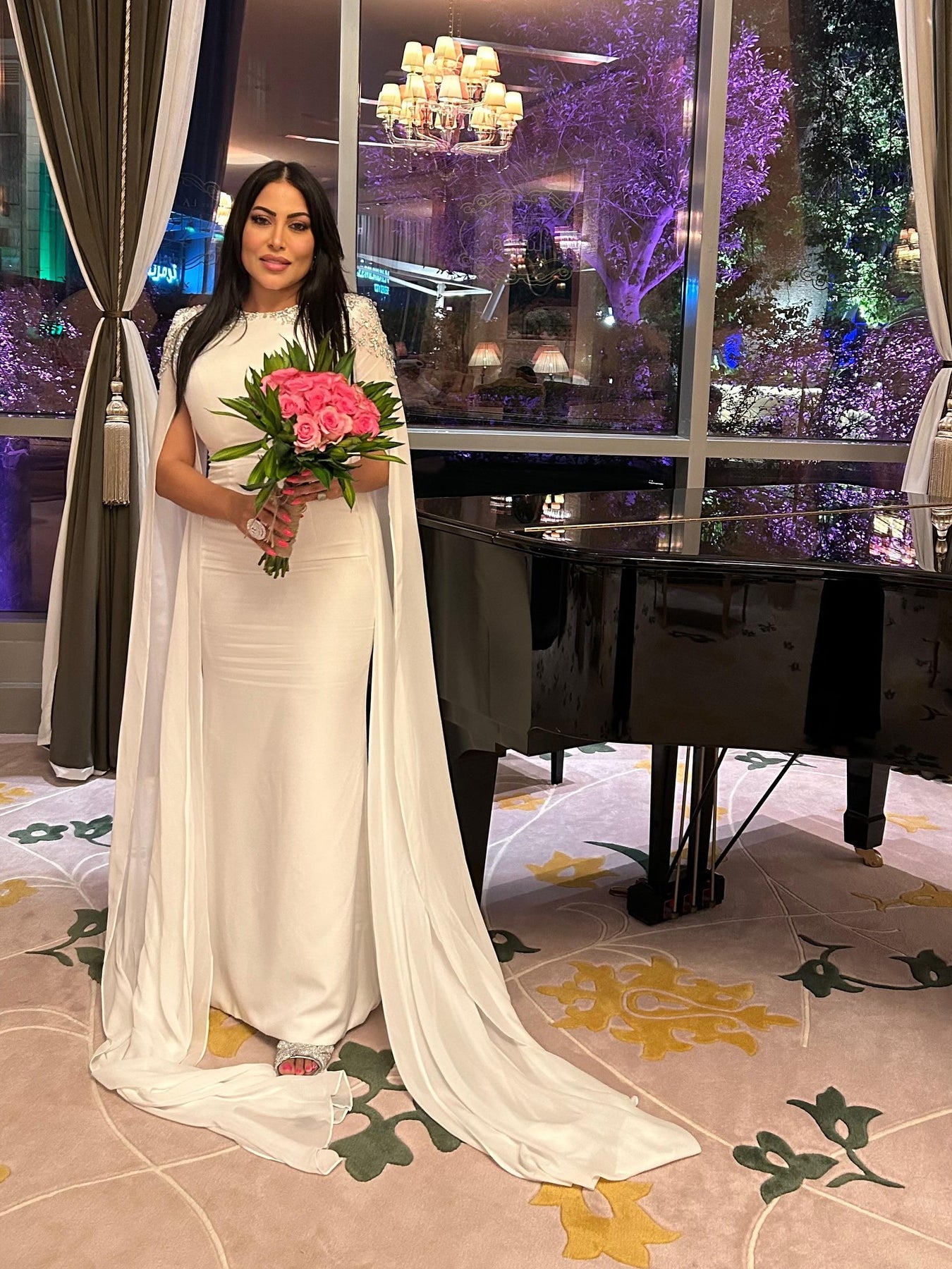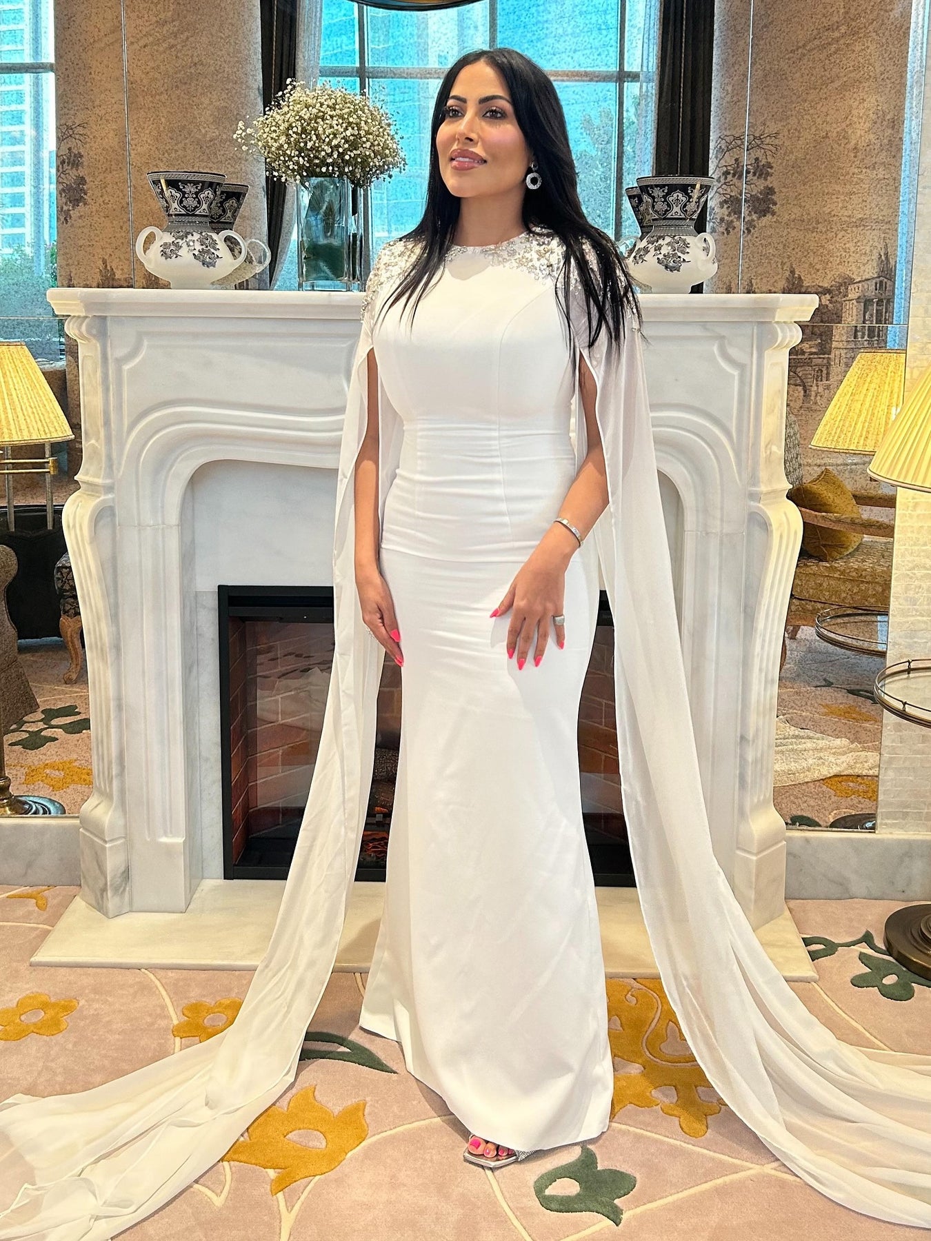 An enchanting black gown featuring beaded shoulder embellishments and dramatic sheer cape sleeves. Flowing with timeless grace, it’s the perfect statement piece for galas and evening events.