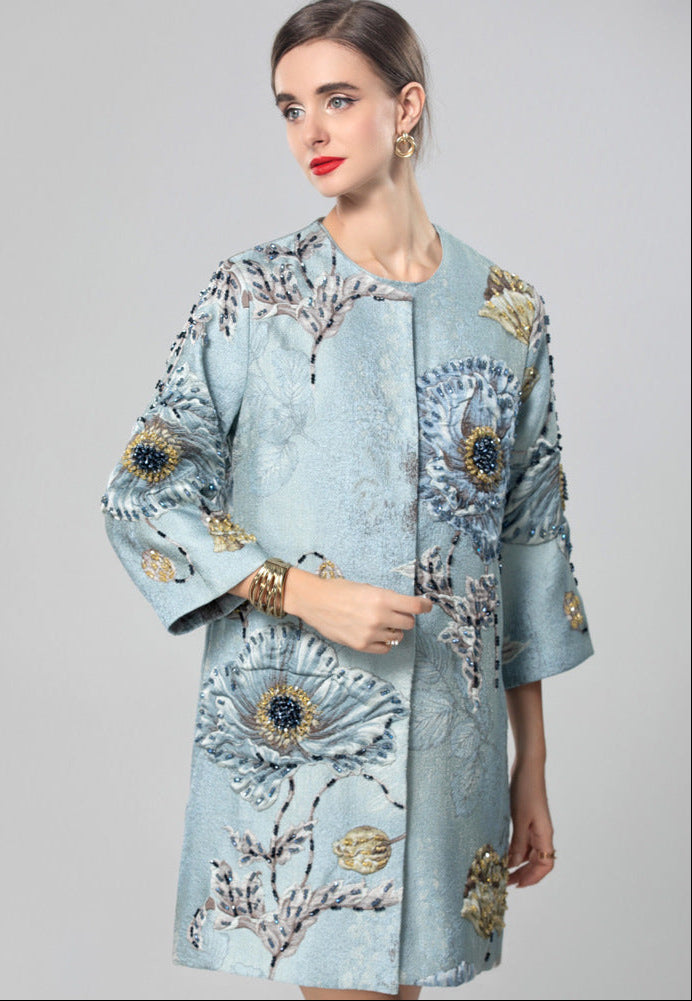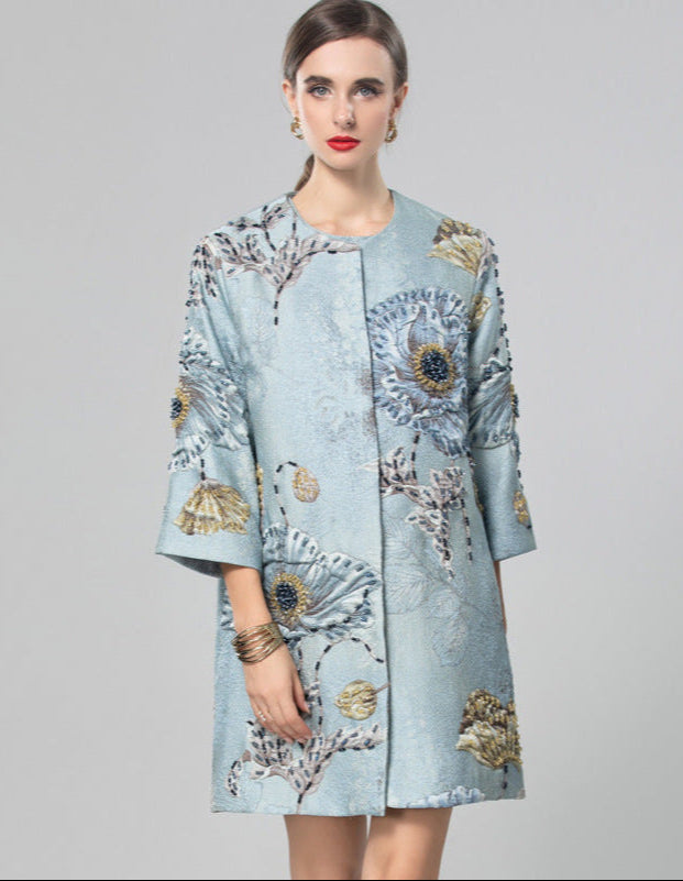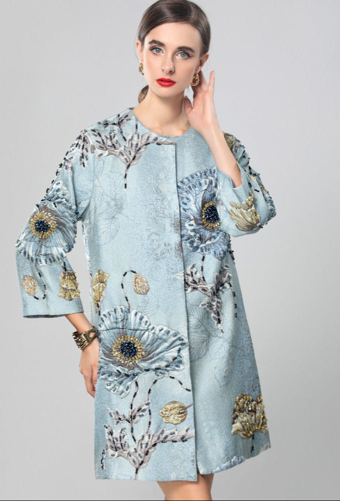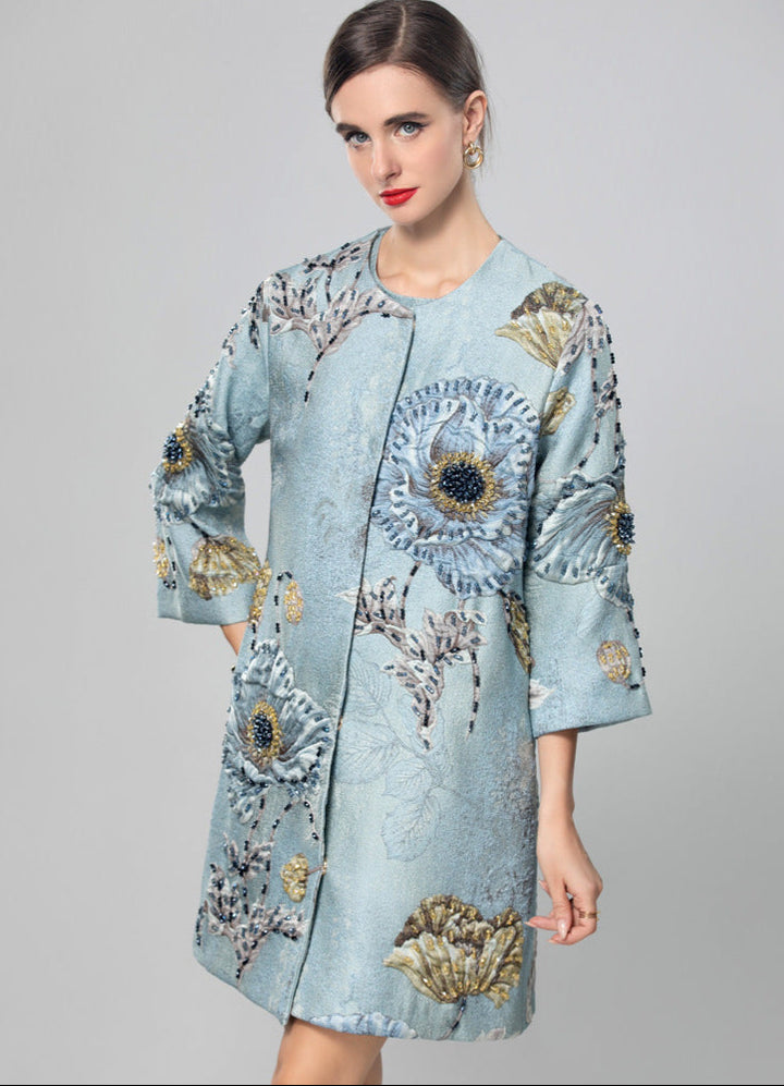 A luxurious light blue brocade jacket with intricate floral embroidery and three-quarter sleeves. Its structured design and artistic texture make it a distinctive layering piece.