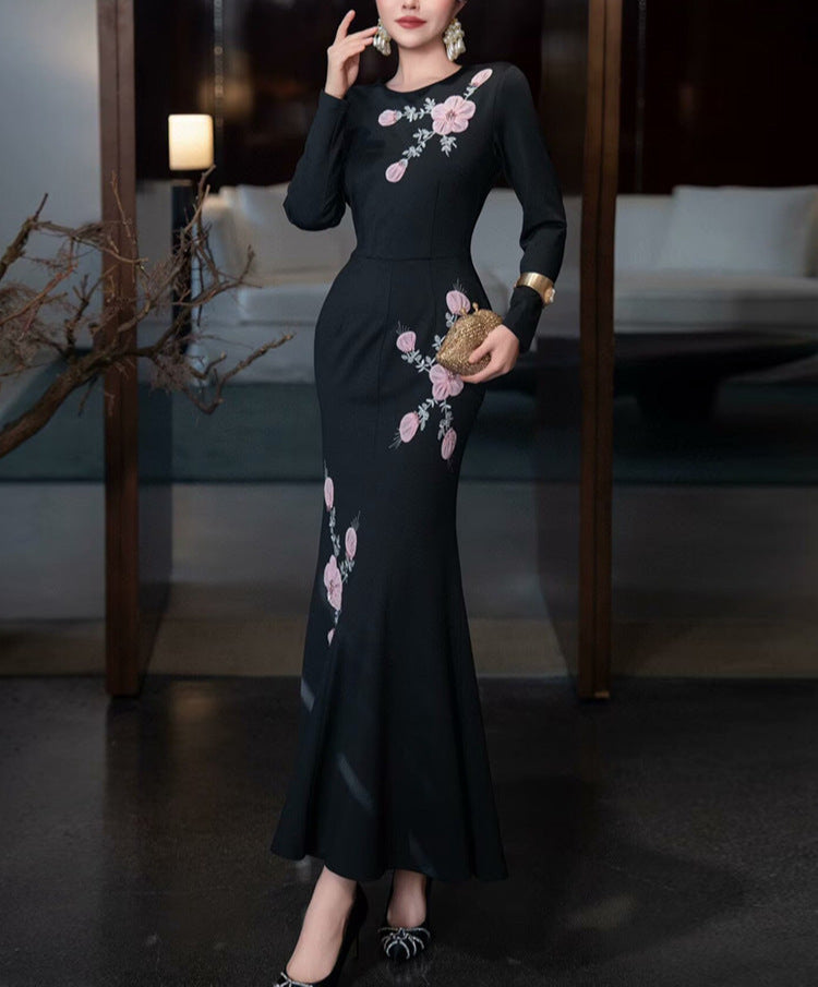 Sleek black mermaid gown featuring delicate pink rose appliqué embroidery that cascades along the front. With long sleeves and a sculpted silhouette, it blends elegance and femininity—ideal for evening receptions and formal gatherings.