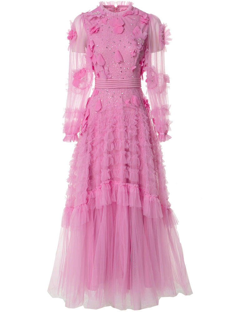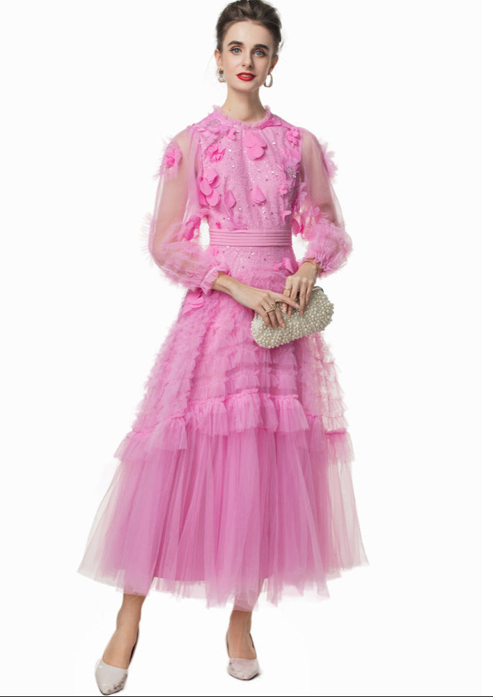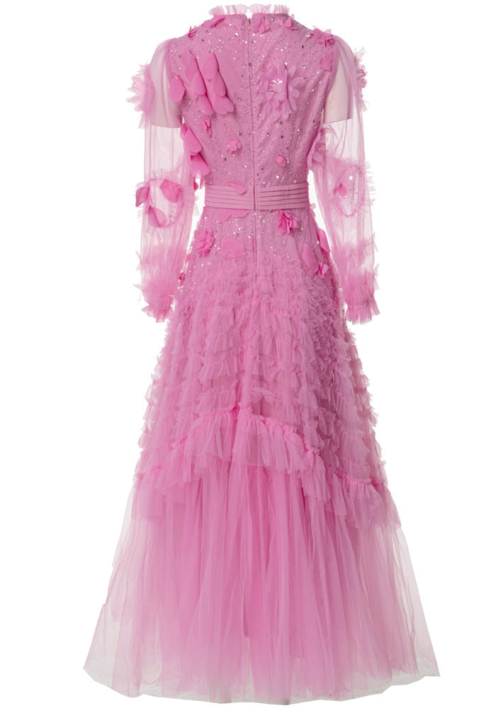 A vibrant pink gown featuring long sheer sleeves, a cinched waist, and cascading layers of tulle embellished with delicate 3D floral embroidery and pearls. Its romantic design and full skirt make it perfect.
