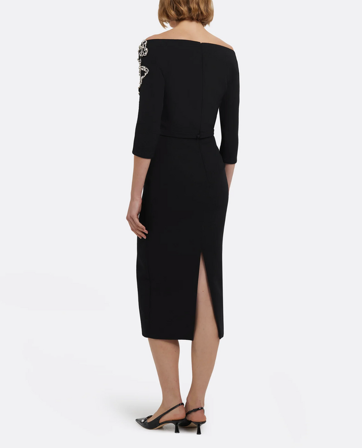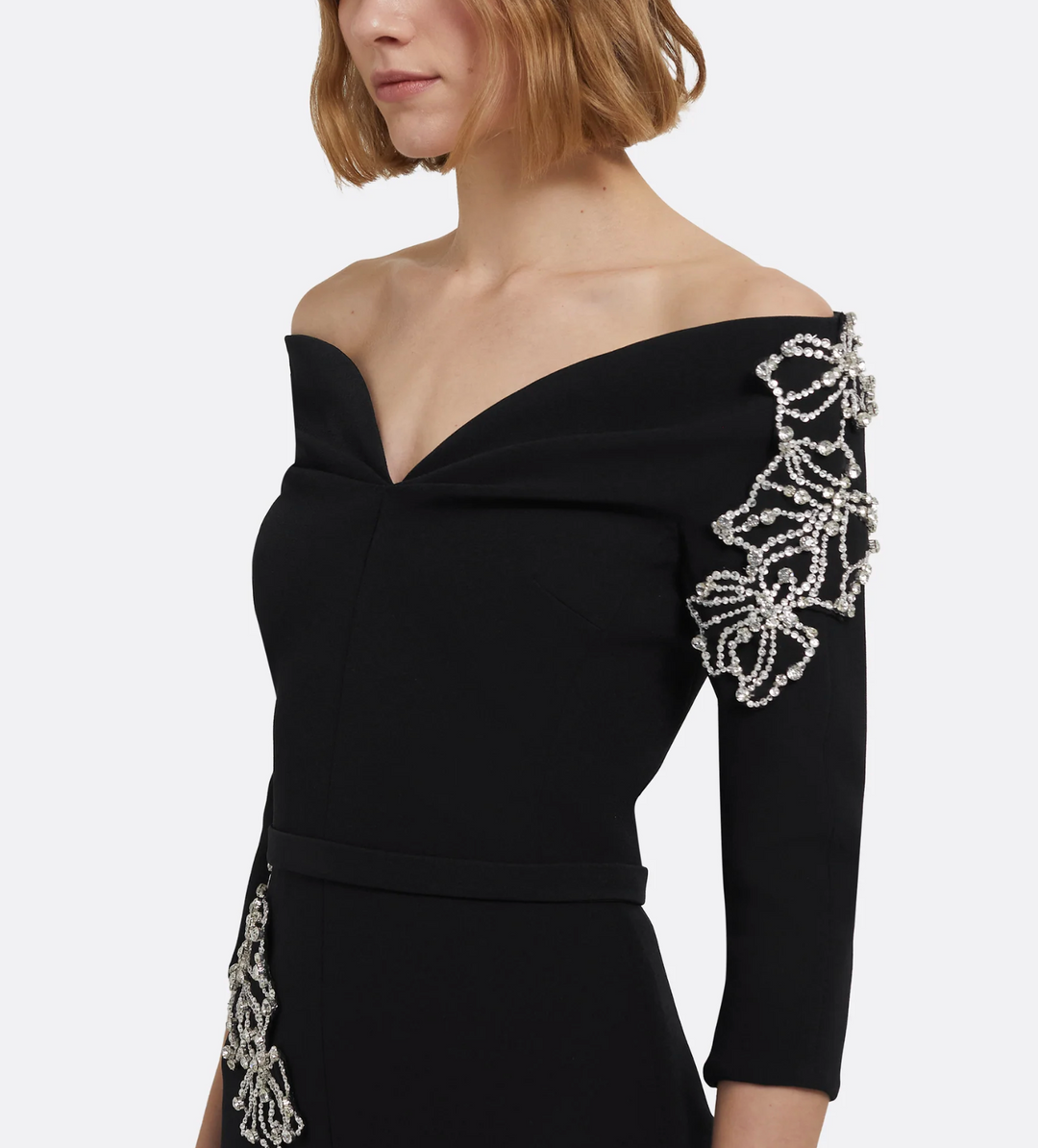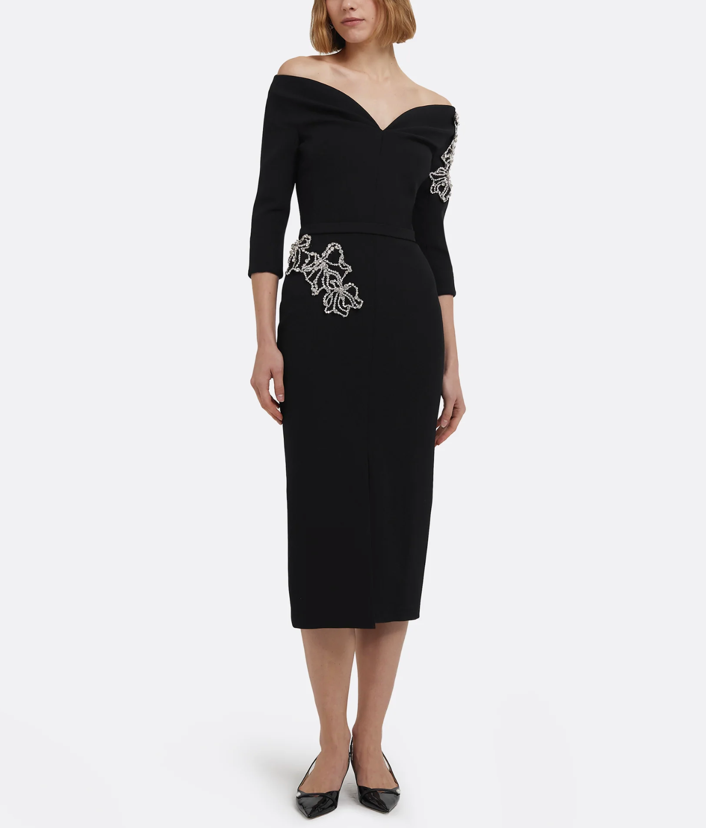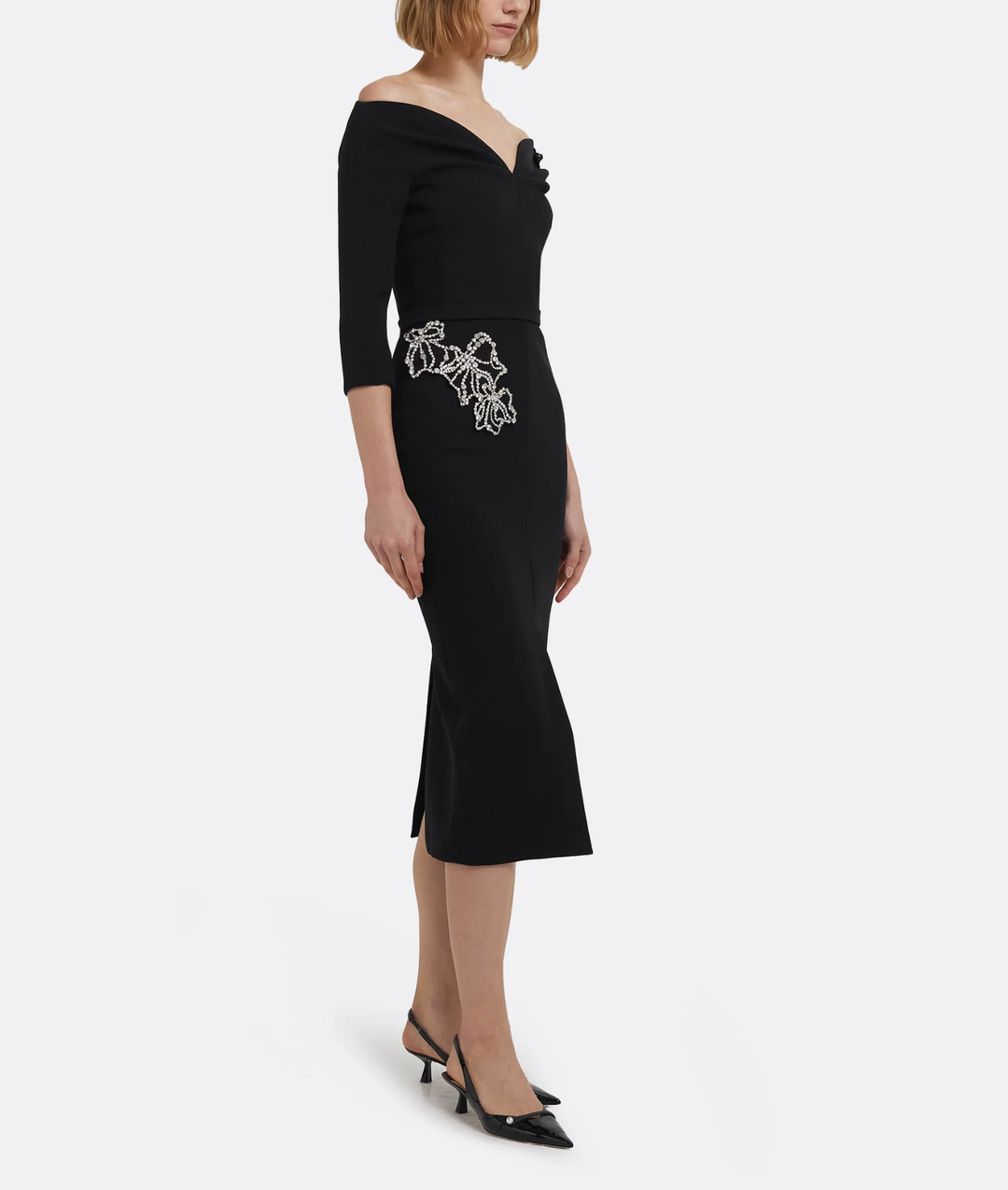 Refined and feminine, this off-shoulder black midi dress features a structured neckline, three-quarter sleeves, and intricate pearl floral embroidery for a touch of timeless elegance. Ideal for formal dinners or elegant receptions.