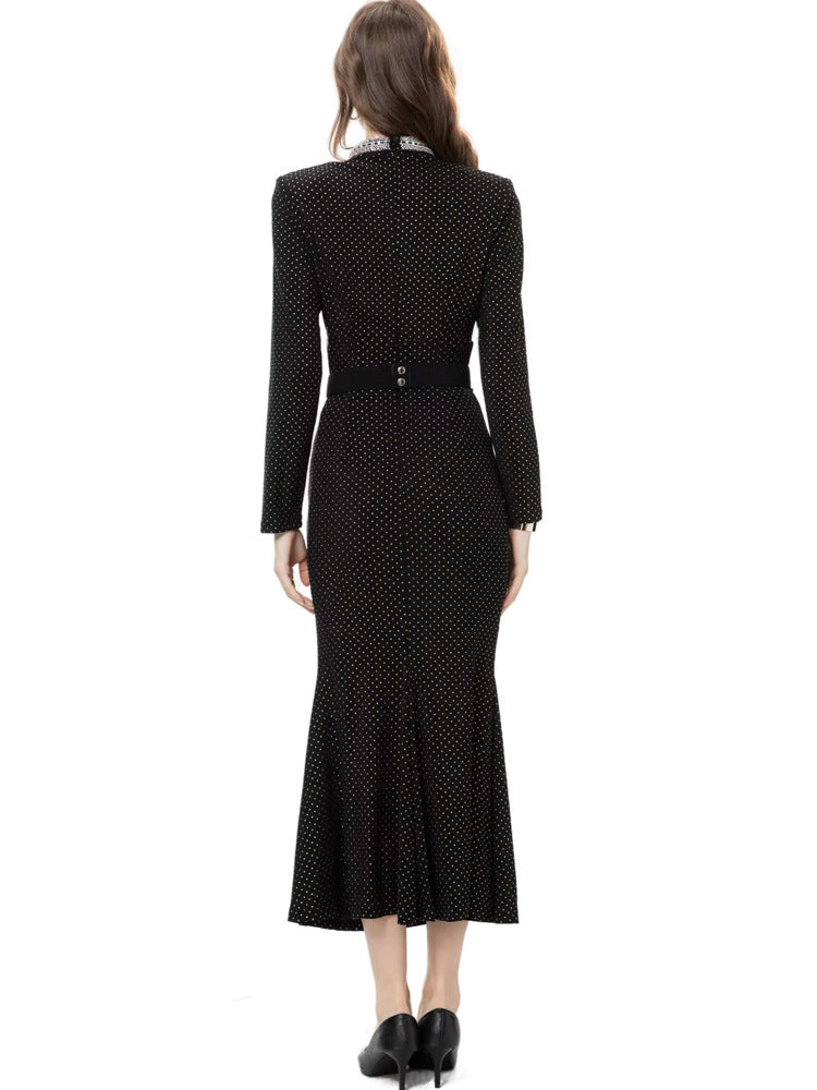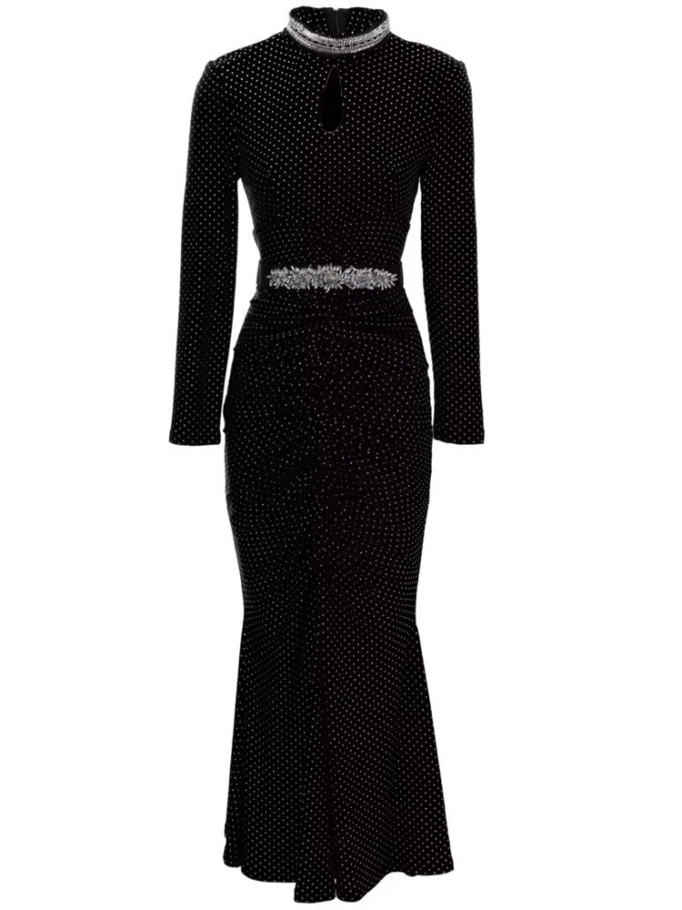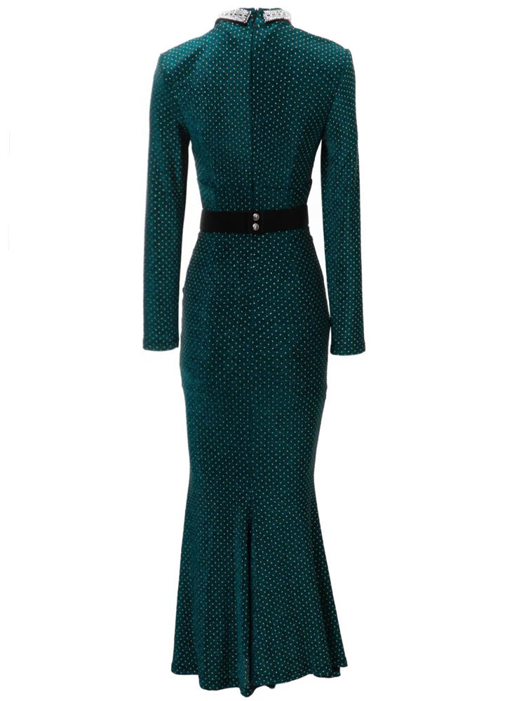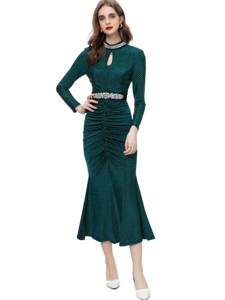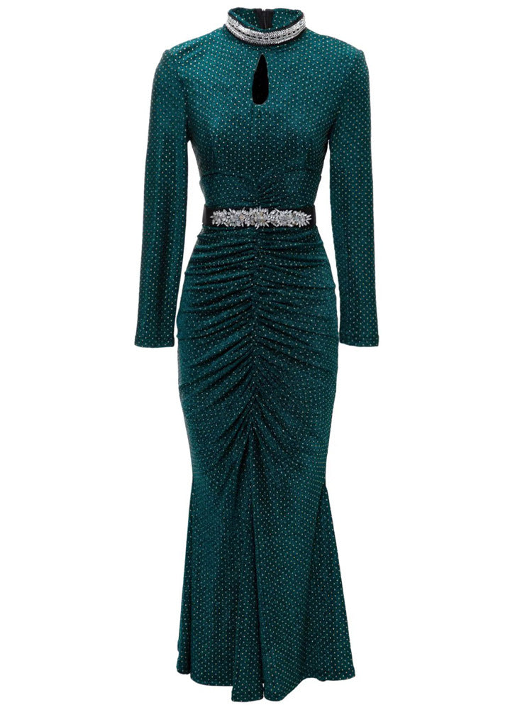 This sleek emerald green midi dress features shimmering dotted fabric, elegant ruching through the waist, and a flattering fishtail hem. Accented with a crystal-embellished belt and a keyhole neckline, it’s perfect for glamorous evenings and formal occasions.