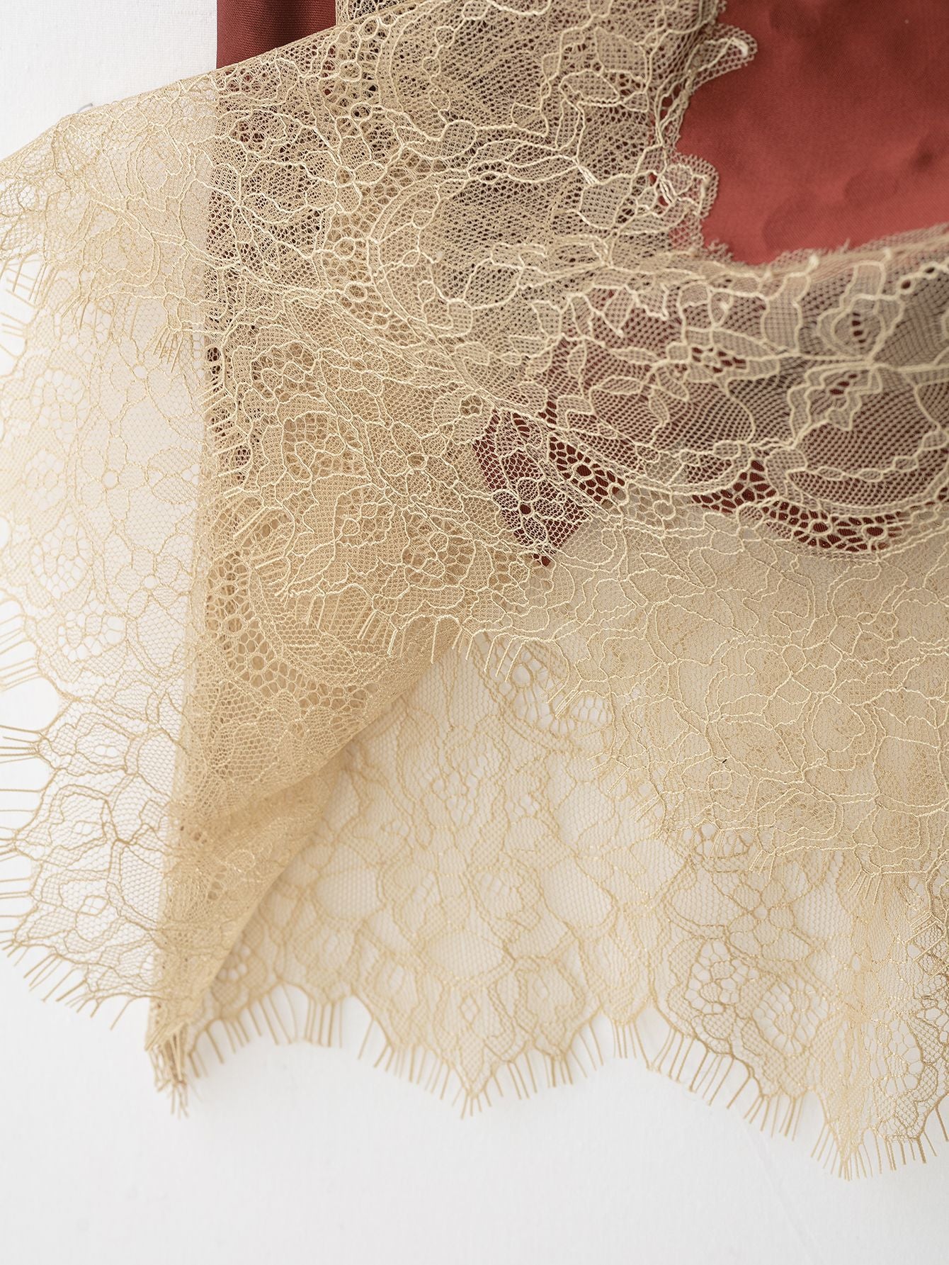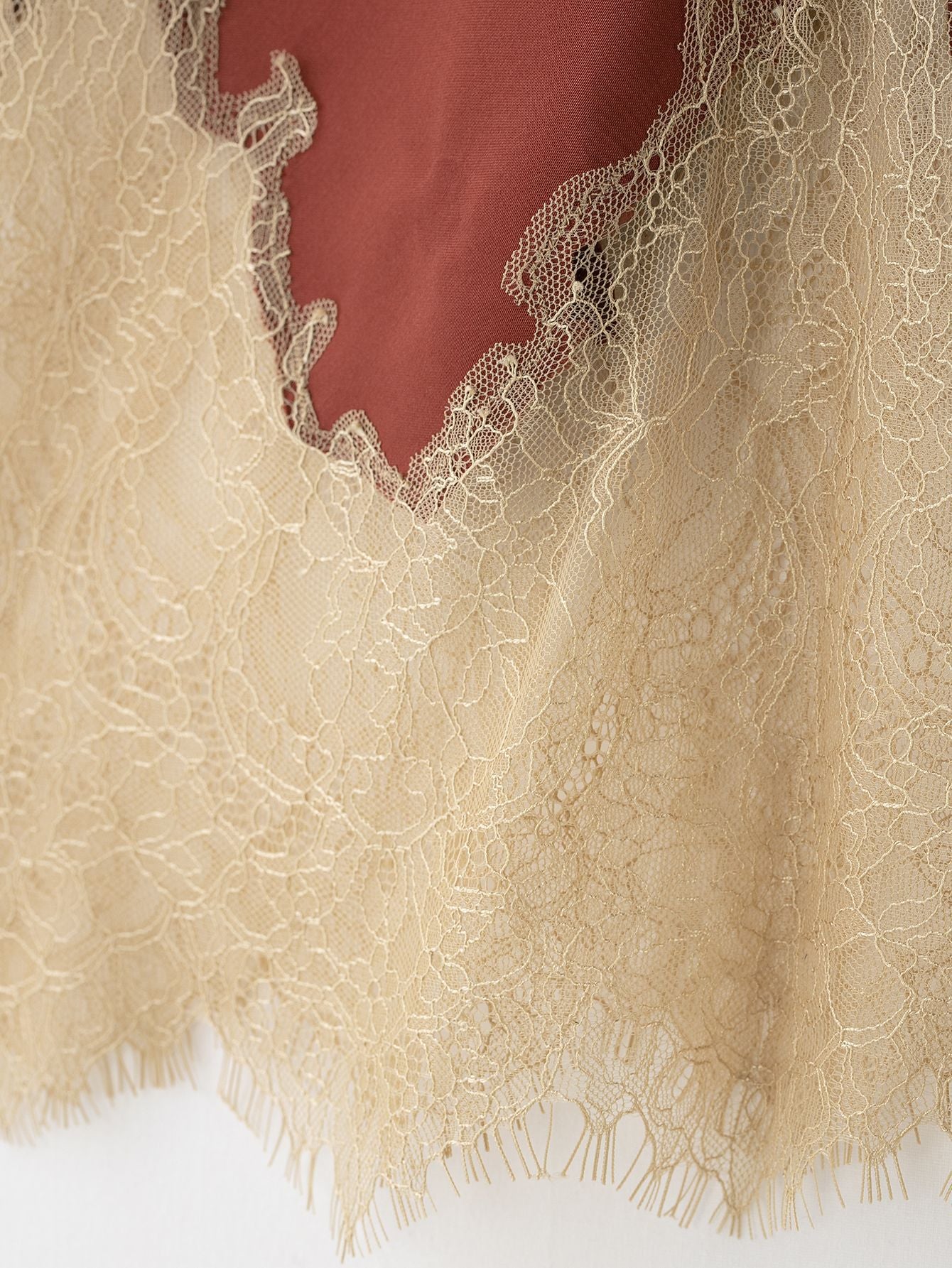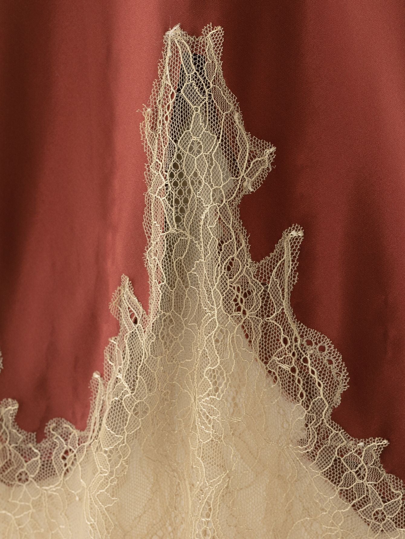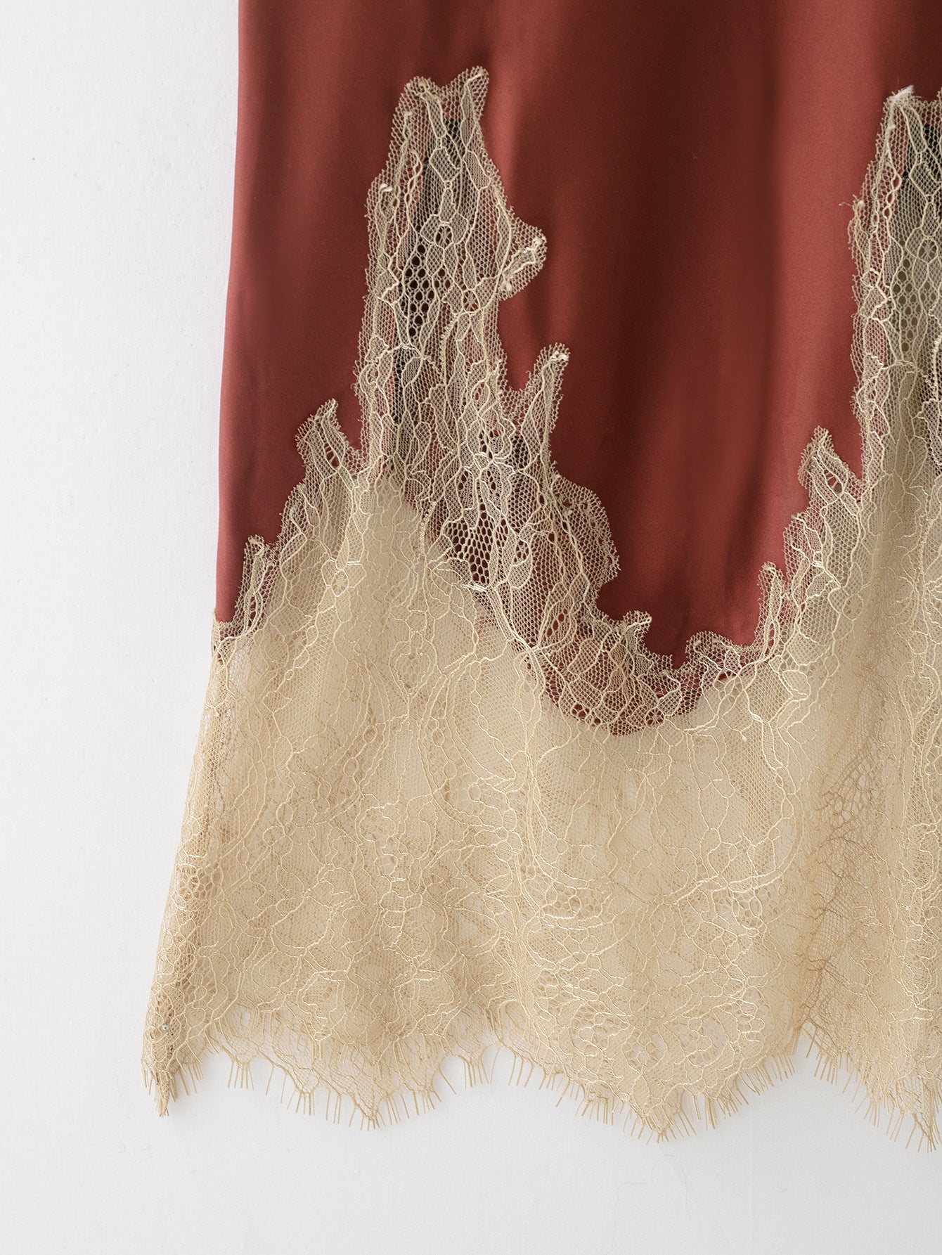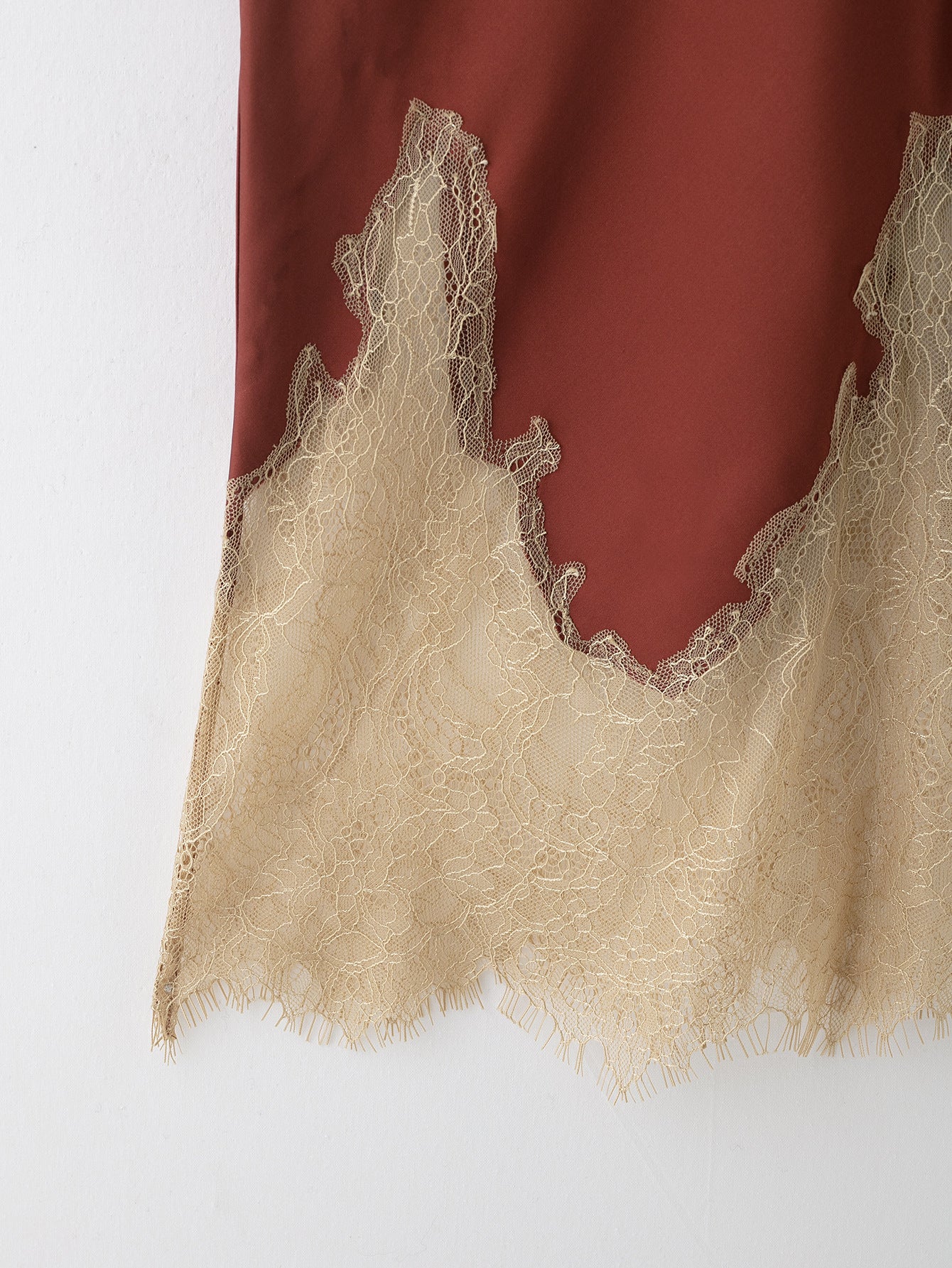 An elegant satin midi skirt finished with delicate lace detailing along the hem for a refined, feminine touch. Designed with a fluid drape and subtle sheen, this piece moves beautifully with every step—perfect for elevated evening looks or sophisticated day styling paired with knits or tailored tops.