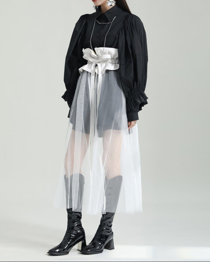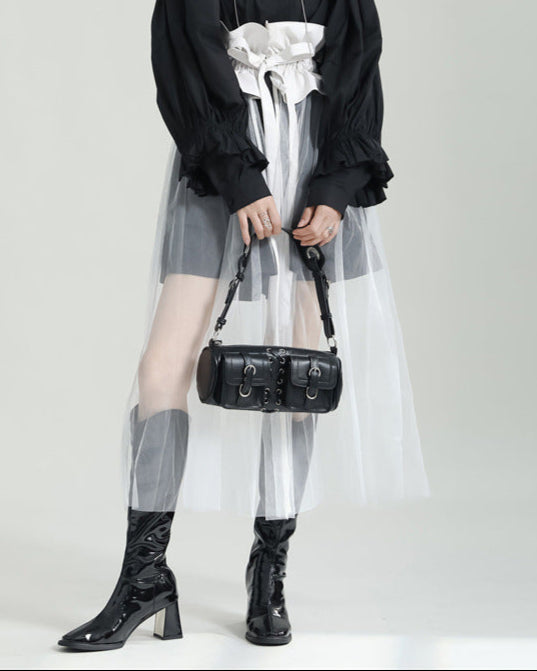 Sculptural sans effort, ce sac tissé noir et blanc présente une silhouette incurvée, des poignées supérieures structurées et un passepoil noir élégant. Un compagnon léger mais audacieux pour vos essentiels quotidiens.