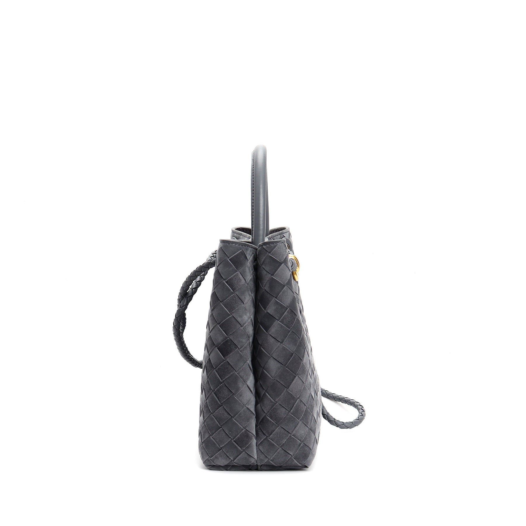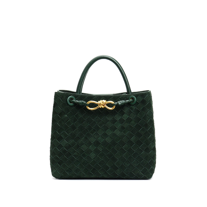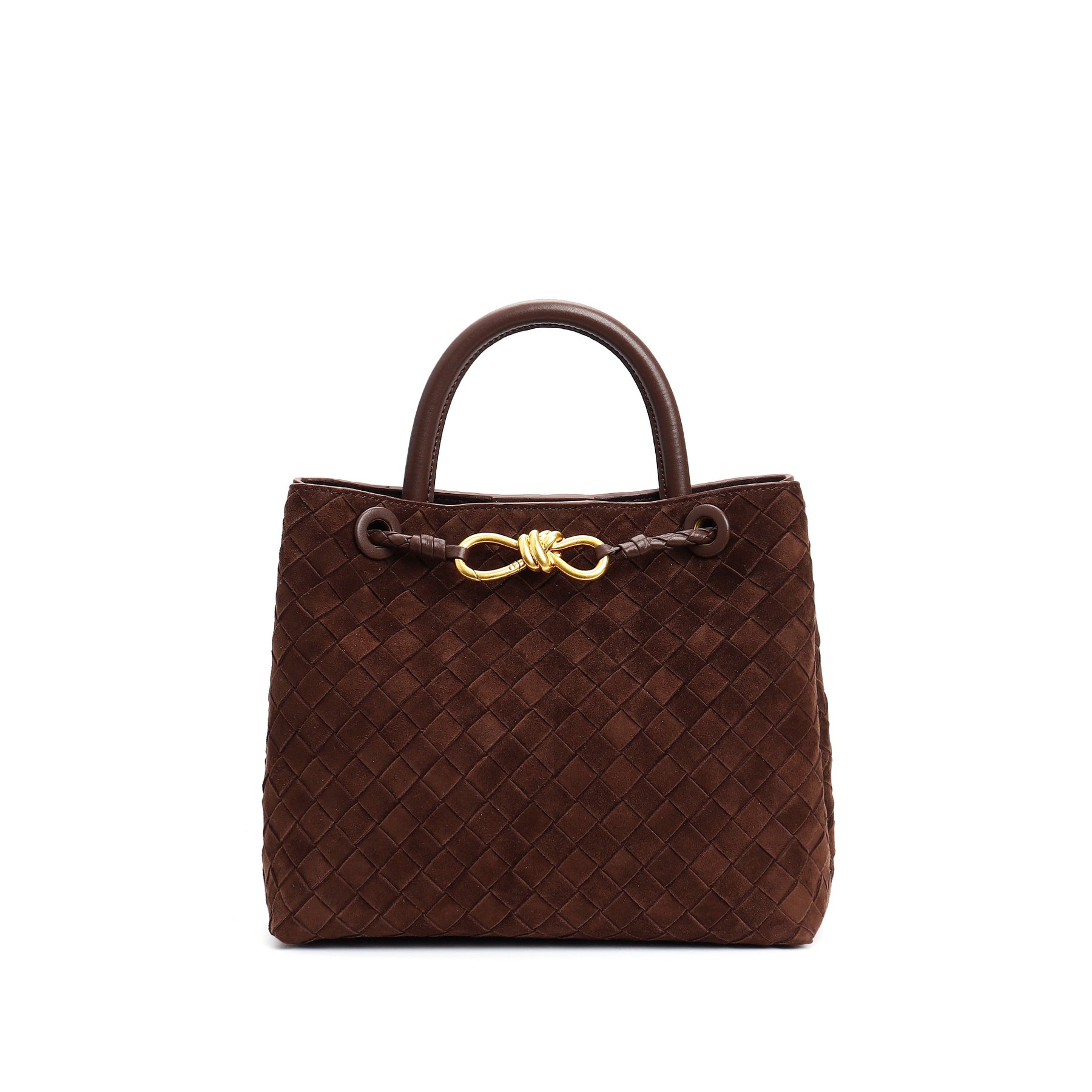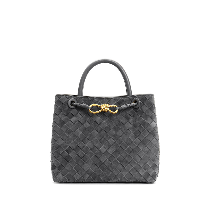 Sculptural sans effort, ce sac tissé noir et blanc présente une silhouette incurvée, des poignées supérieures structurées et un passepoil noir élégant. Un compagnon léger mais audacieux pour vos essentiels quotidiens.