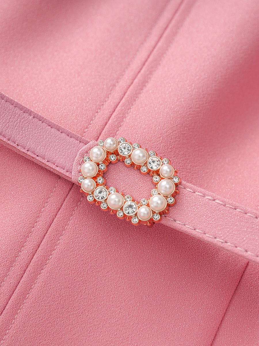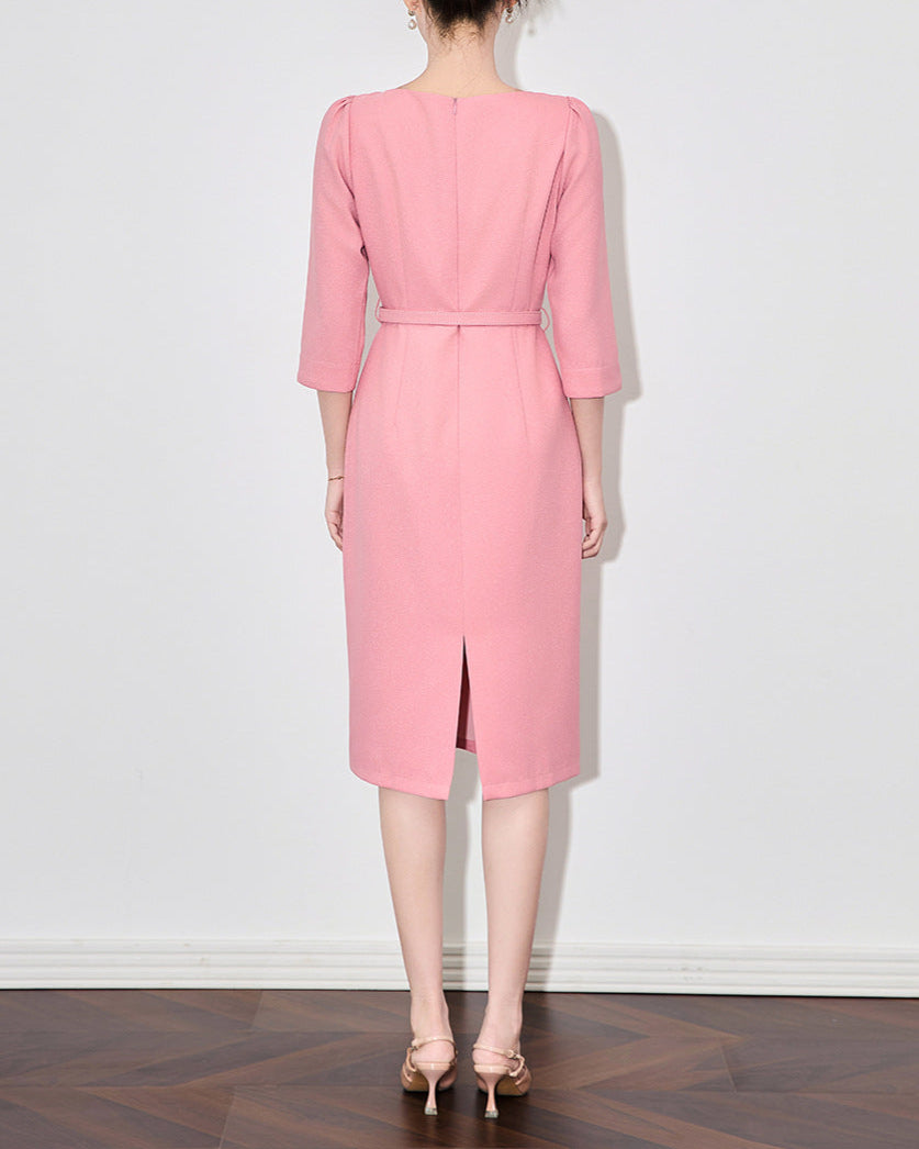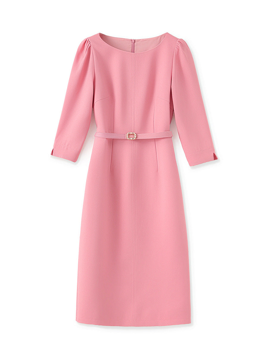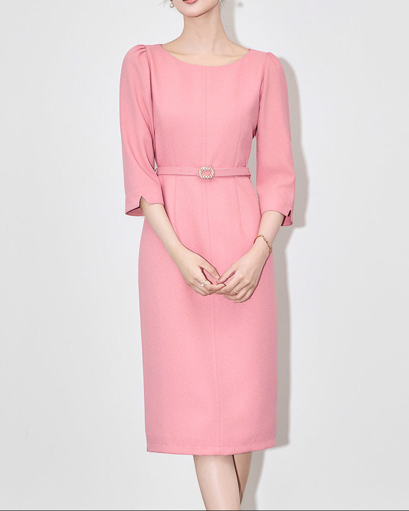 Une robe moderne et ample avec une coupe classique, dotée d'un décolleté carré, de boutons asymétriques, et d'une taille cintrée par une élégante ceinture dorée.