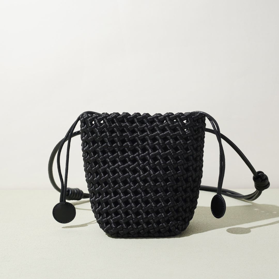 Sculptural sans effort, ce sac tissé noir et blanc présente une silhouette incurvée, des poignées supérieures structurées et un passepoil noir élégant. Un compagnon léger mais audacieux pour vos essentiels quotidiens.