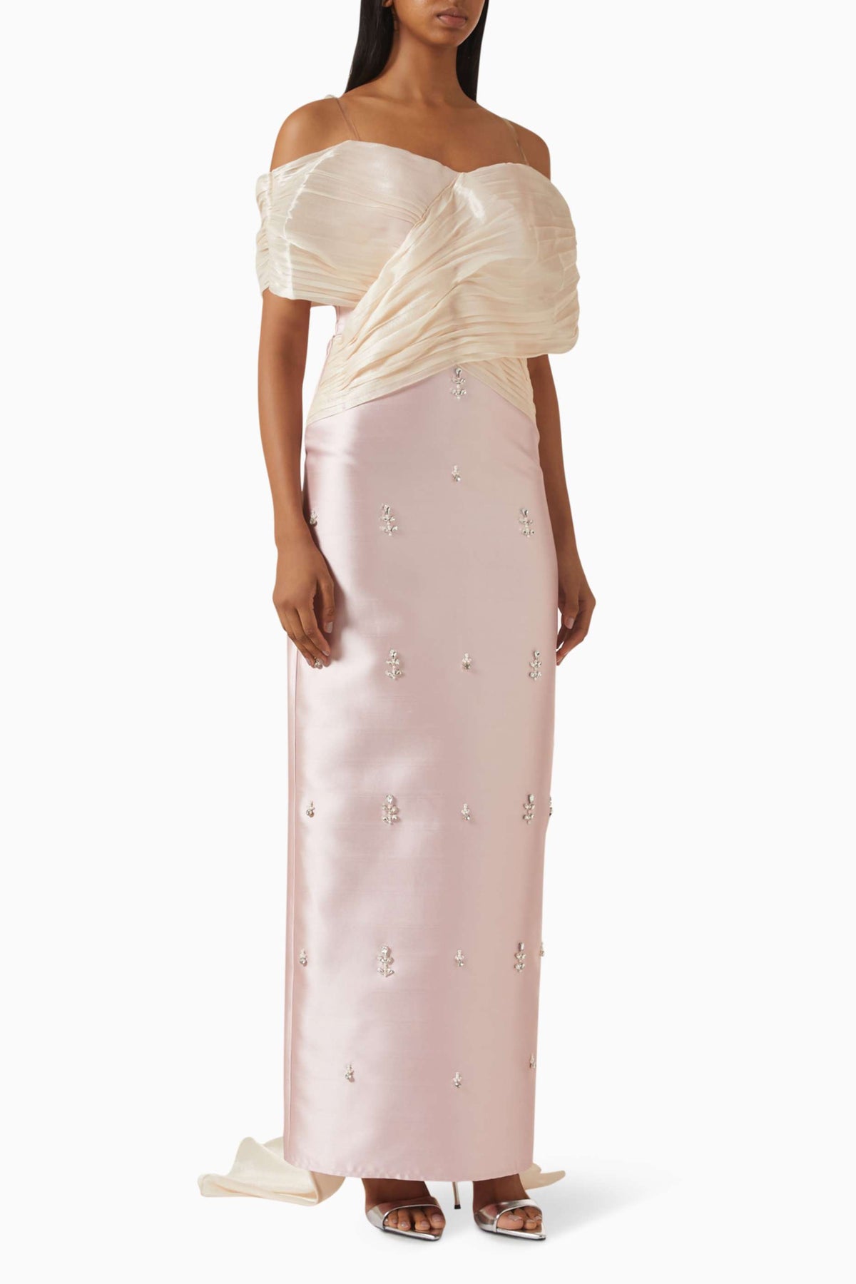 off-shoulder satin gown with embellished skirt – ROSALINE