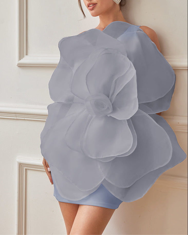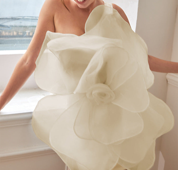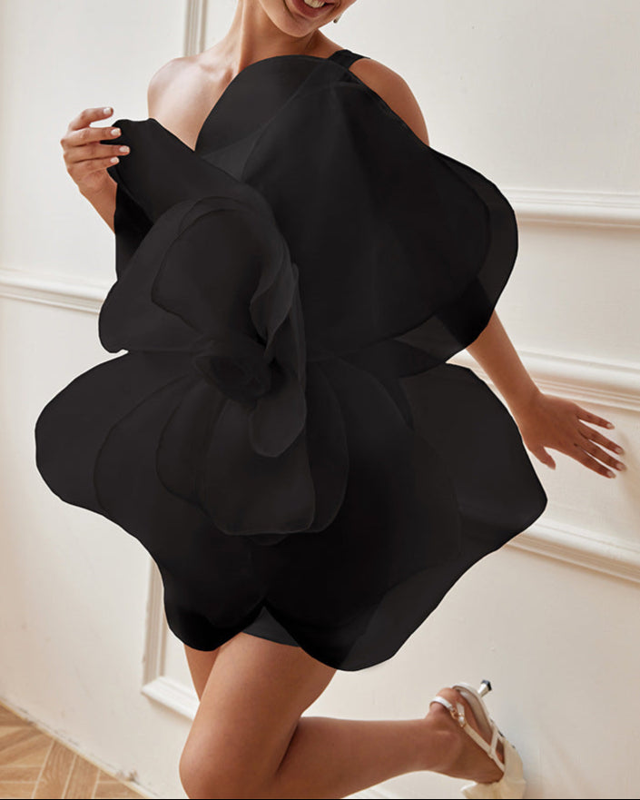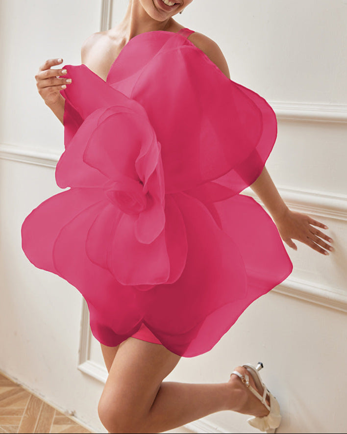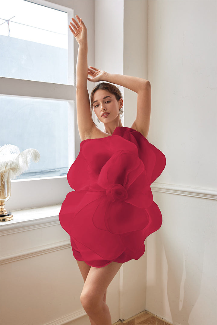 Cette robe colonne audacieuse sans bretelles captive par sa structure sculptée et ses appliqués floraux surdimensionnés et dramatiques qui s'épanouissent aux hanches. Confectionnée en rouge vibrant, elle offre un impact de haute couture parfait pour les tapis rouges, les galas et les occasions de déclaration artistique.