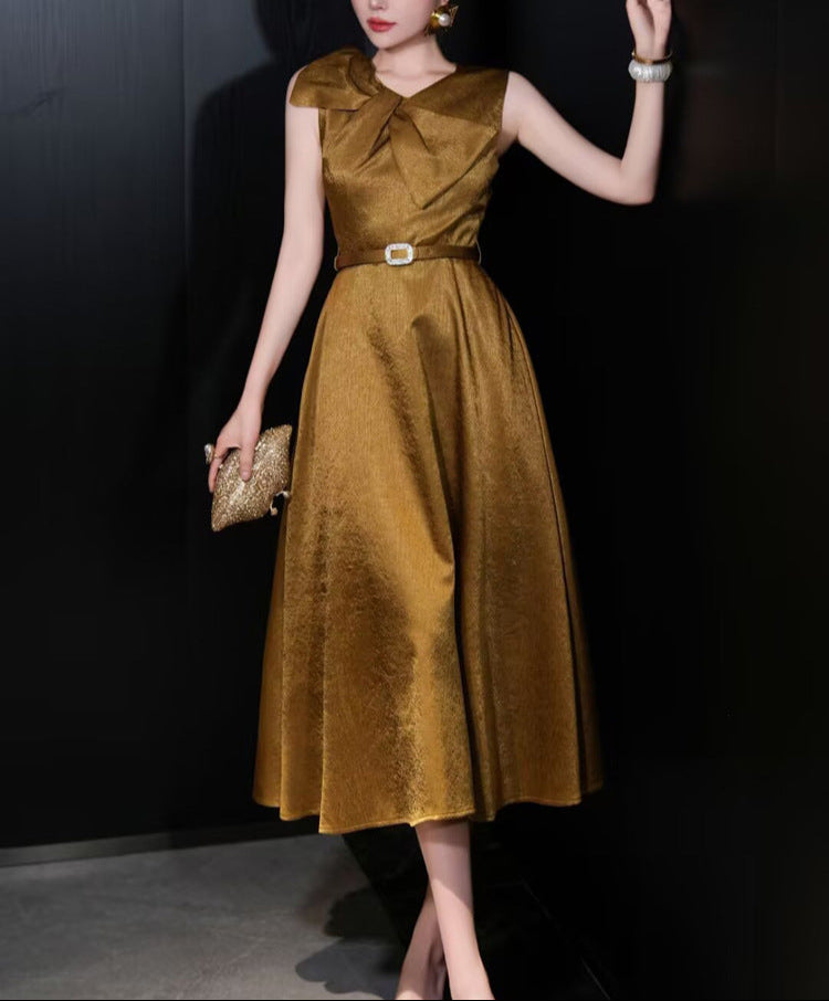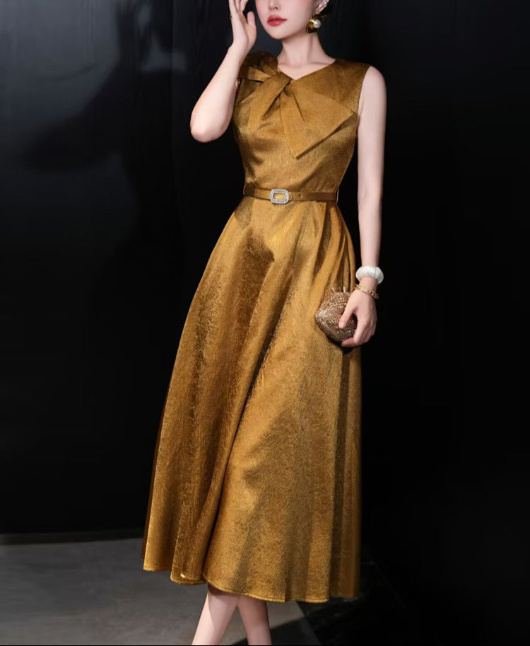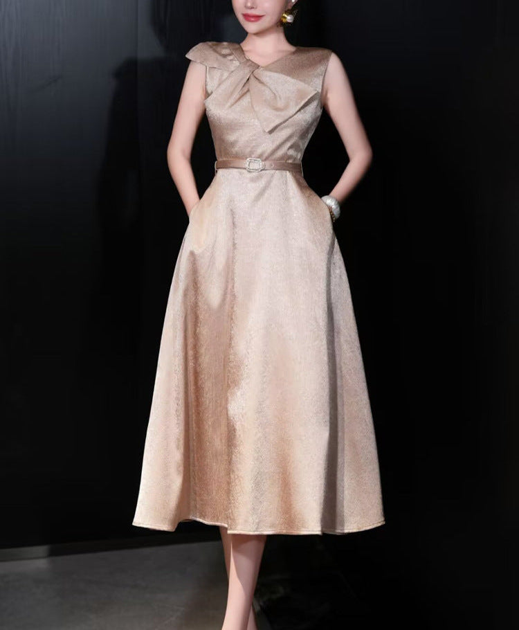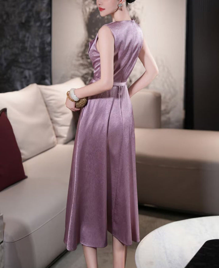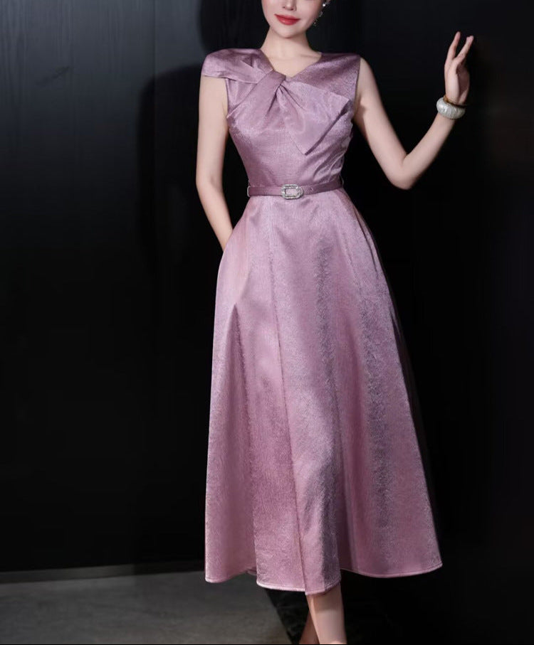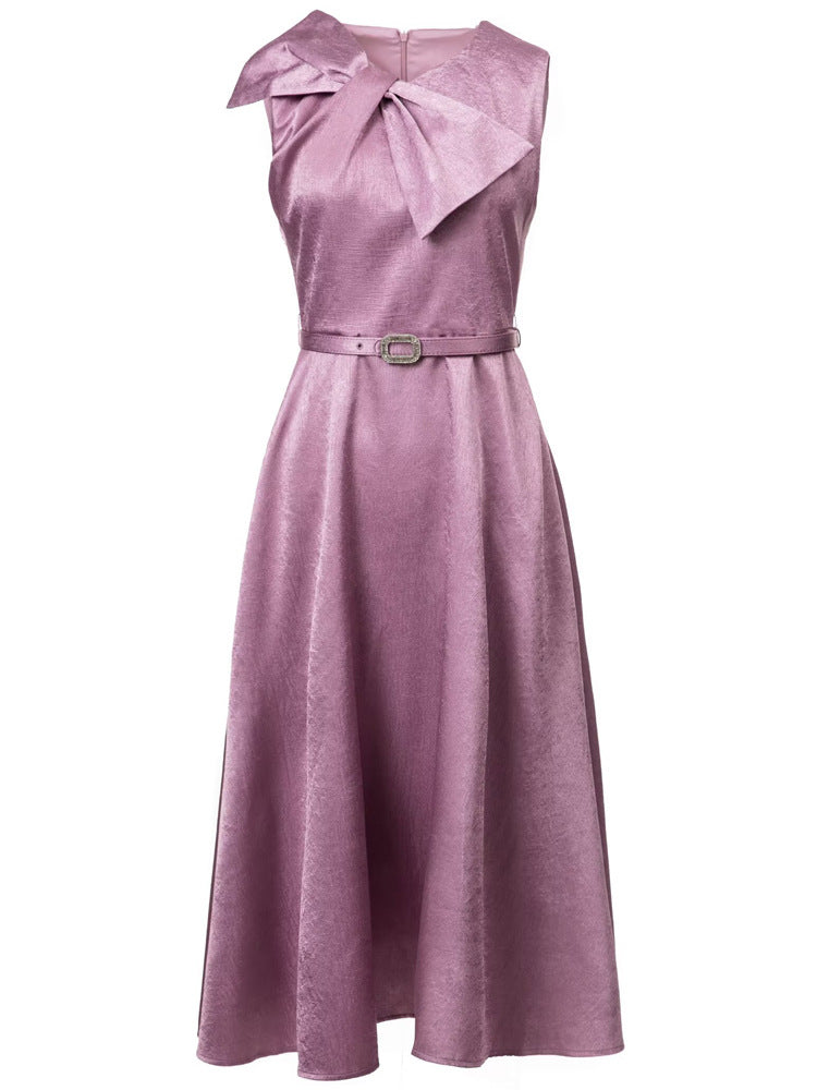 Chic and graceful, this mauve A-line dress features a lustrous satin texture, sculpted bow neckline, and a slender belted waist. A refined silhouette perfect for cocktail evenings, weddings, or high-end occasions.