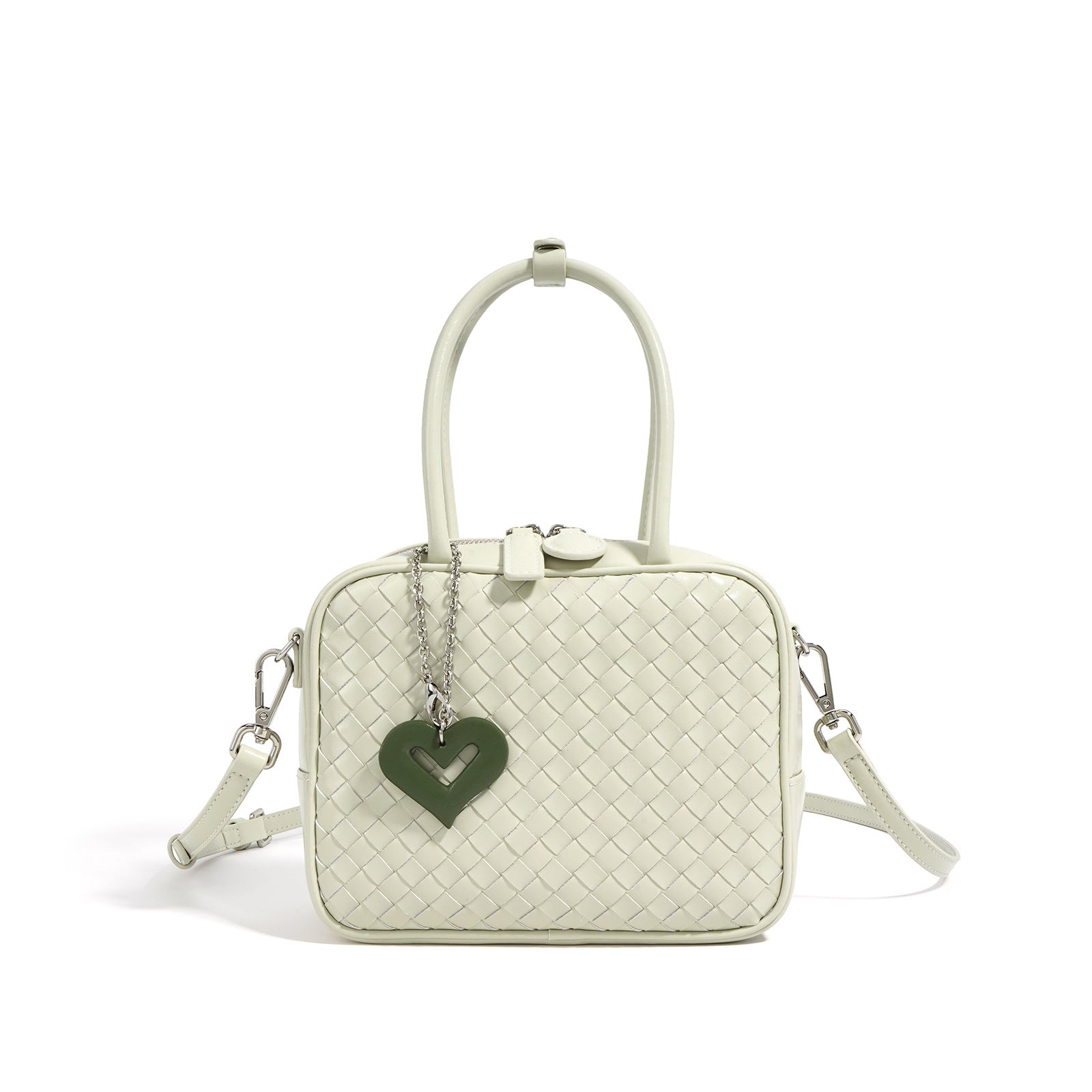 Sculptural sans effort, ce sac tissé noir et blanc présente une silhouette incurvée, des poignées supérieures structurées et un passepoil noir élégant. Un compagnon léger mais audacieux pour vos essentiels quotidiens.