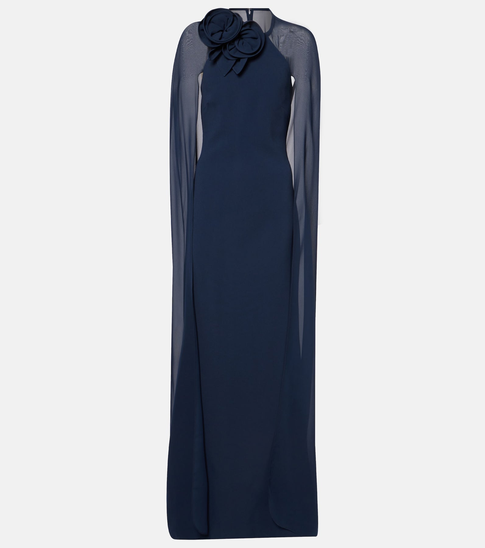 Majestic navy gown featuring a sleek column silhouette, sheer cape sleeves, and a dramatic sculpted floral accent at the shoulder—an exquisite statement of modern elegance and regal allure.