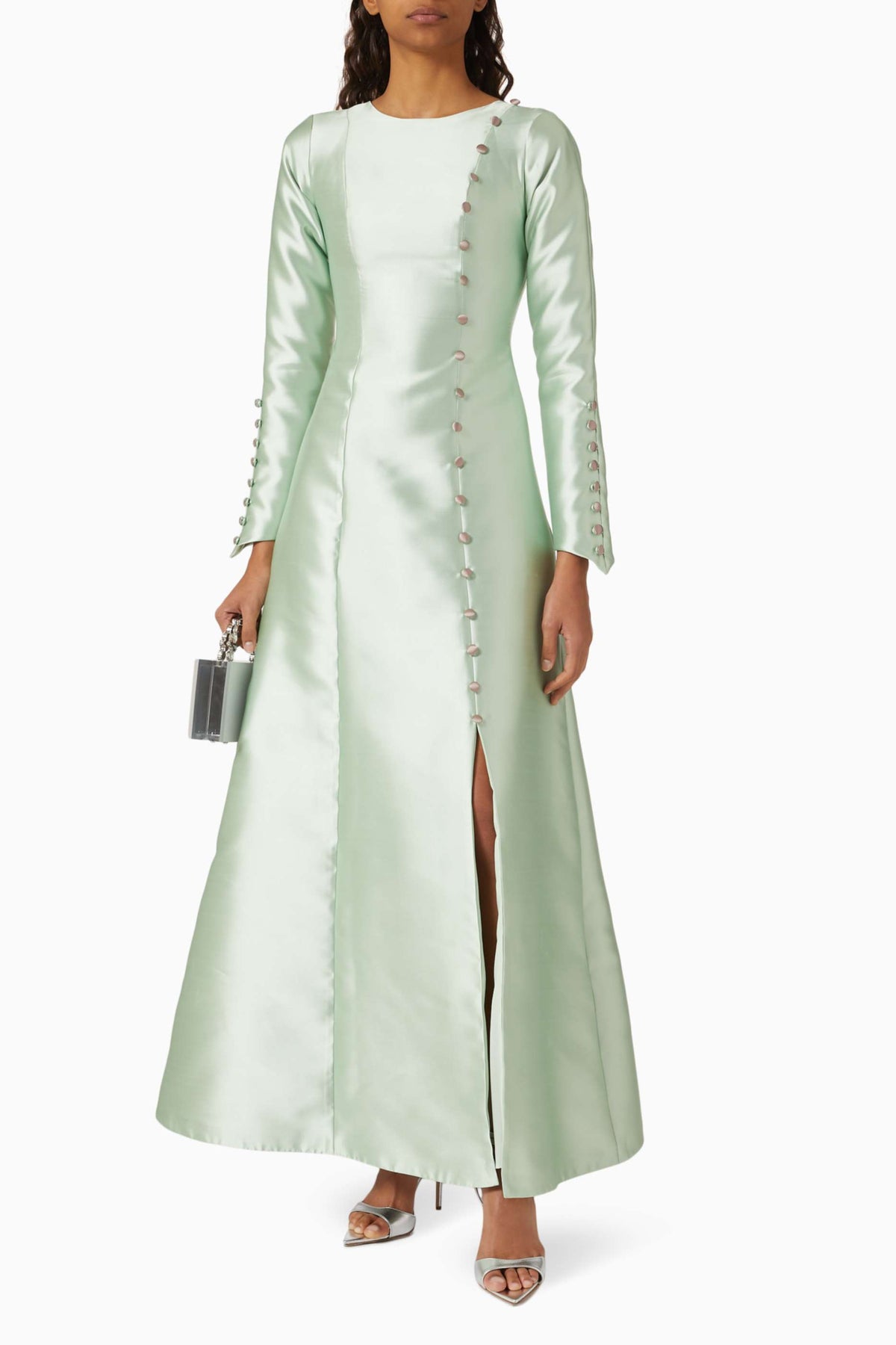 A refined mint-green satin gown featuring a sleek A-line silhouette and elegant button accents cascading diagonally across the bodice and sleeves. Its minimal design and lustrous finish evoke timeless sophistication with a modern twist.