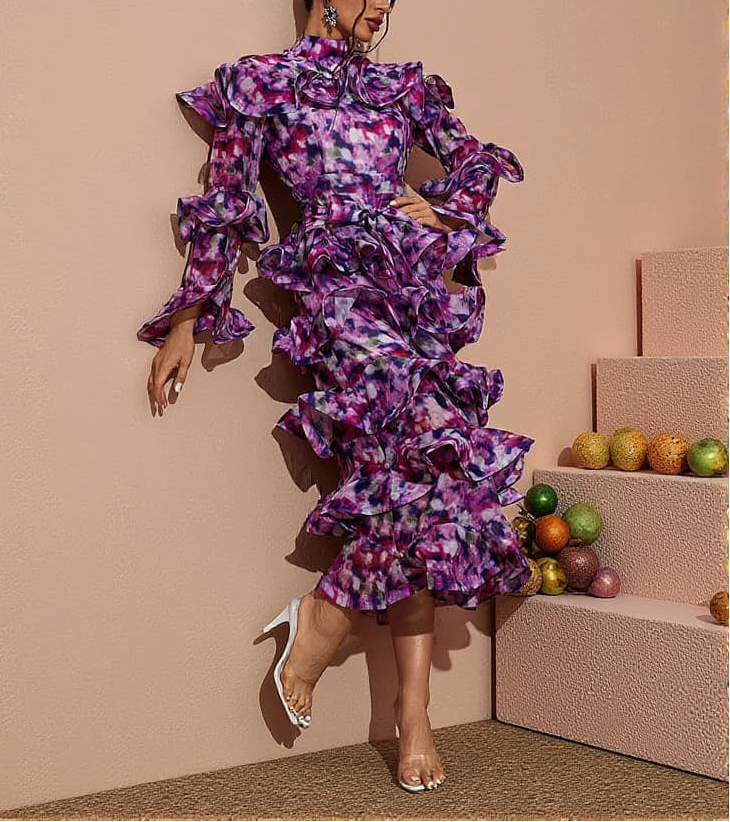 printed ruffle-tier midi dress with high neckline – AMARÉ