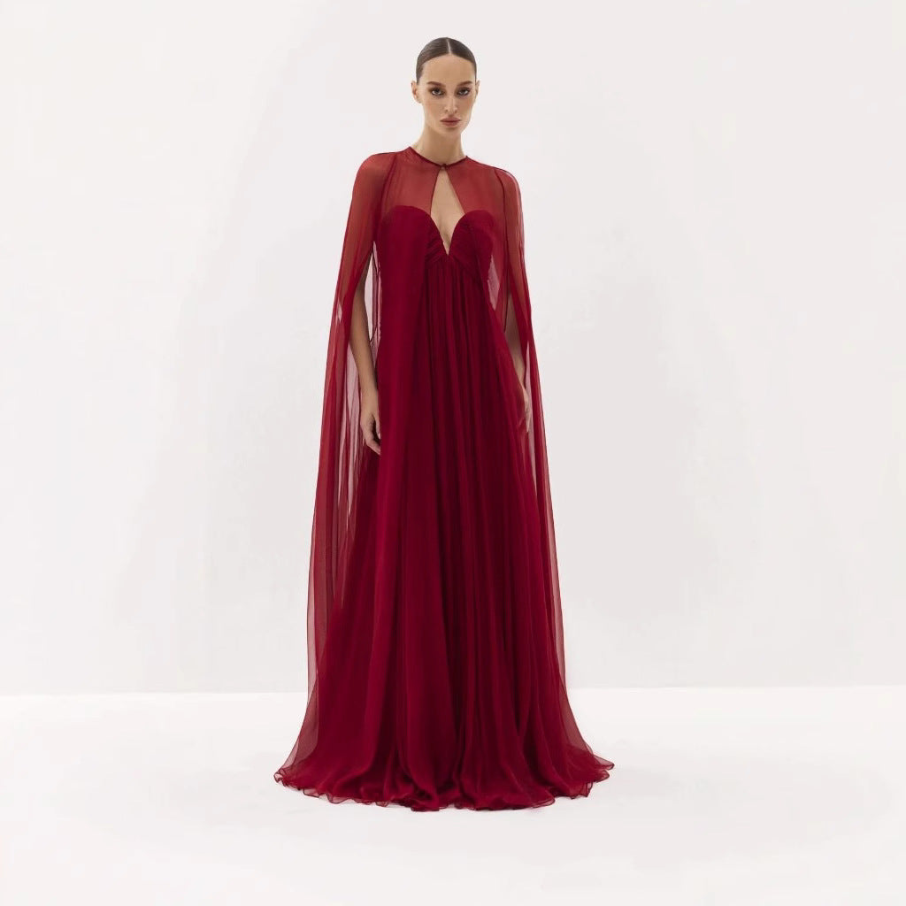 This stunning strapless chiffon gown features a sweetheart neckline, keyhole detailing, and a floor-length sheer cape. Perfect for a chic and edgy look.