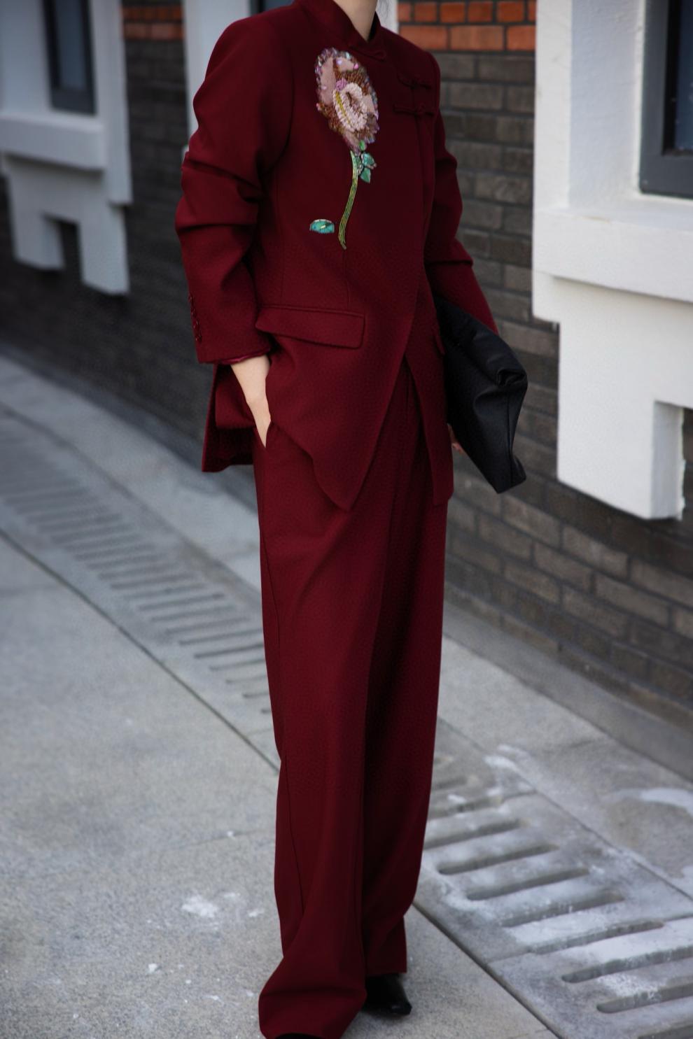 Chic black tailored blazer featuring a stunning hand-sewn sequin floral motif for a touch of elevated femininity. Paired effortlessly with wide-leg trousers for a clean, elongated silhouette—perfect for modern, confident style from day to night.
