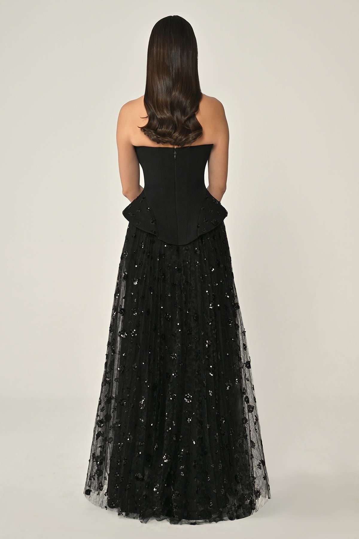 Elegant black evening gown featuring a structured strapless corset bodice and a flowing tulle skirt adorned with shimmering sequins—merging timeless sophistication with a hint of modern allure.
