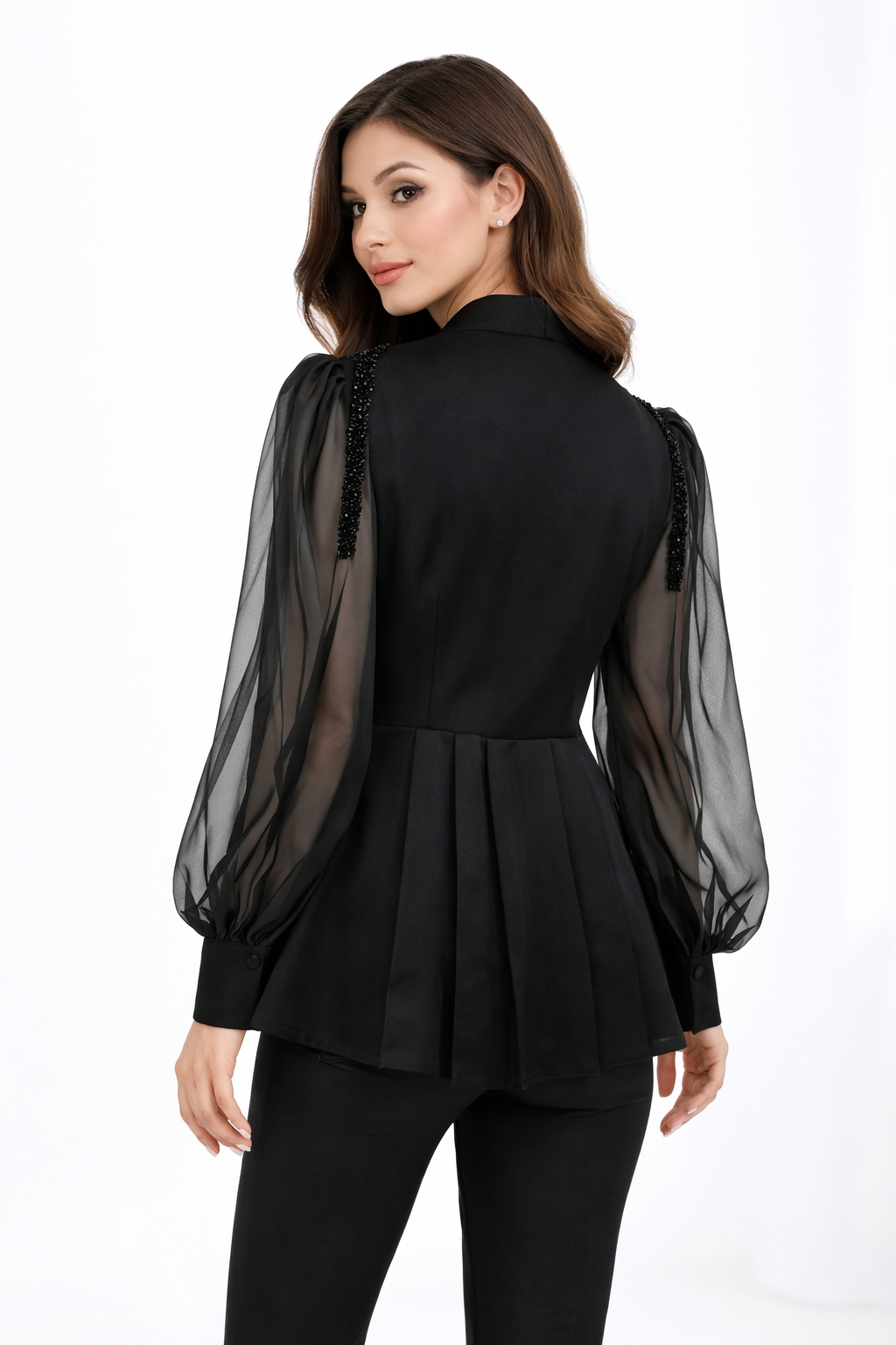 V-neck peplum blouse with sheer sleeves and gold embroidery – AURORA