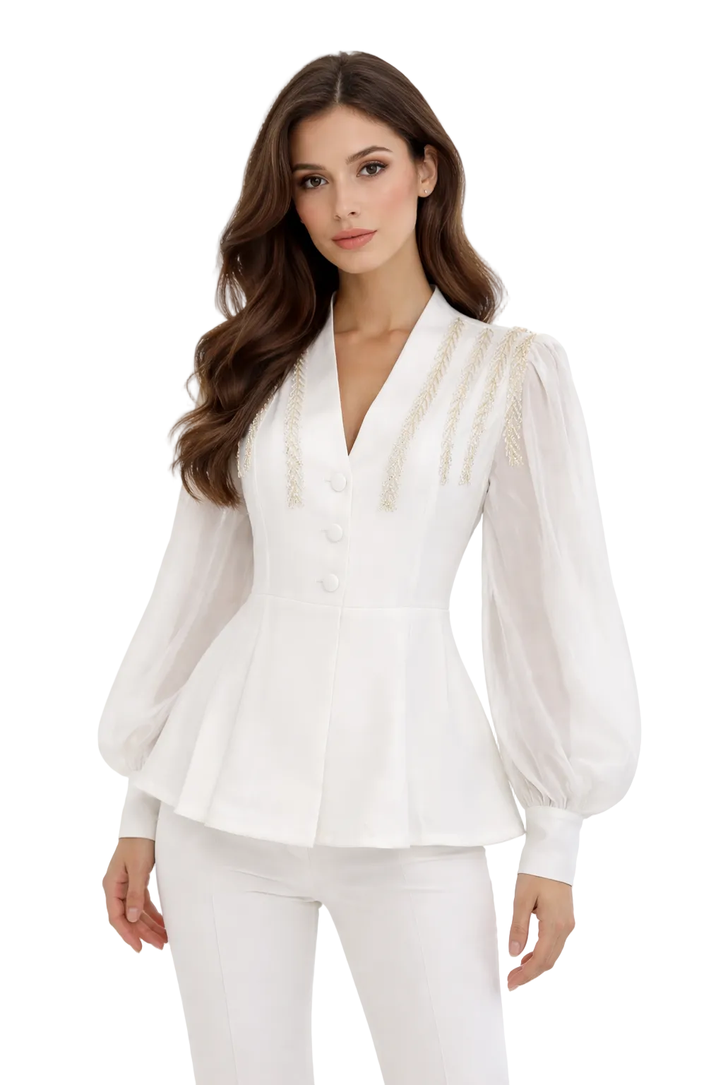 An elegant white peplum blouse designed with a flattering V-neckline, soft sheer long sleeves, and delicate gold embroidered accents on the shoulders. Tailored at the waist with a gentle flare, this refined piece blends femininity and structure—perfect for formal occasions, chic workwear, or elevated evening looks.