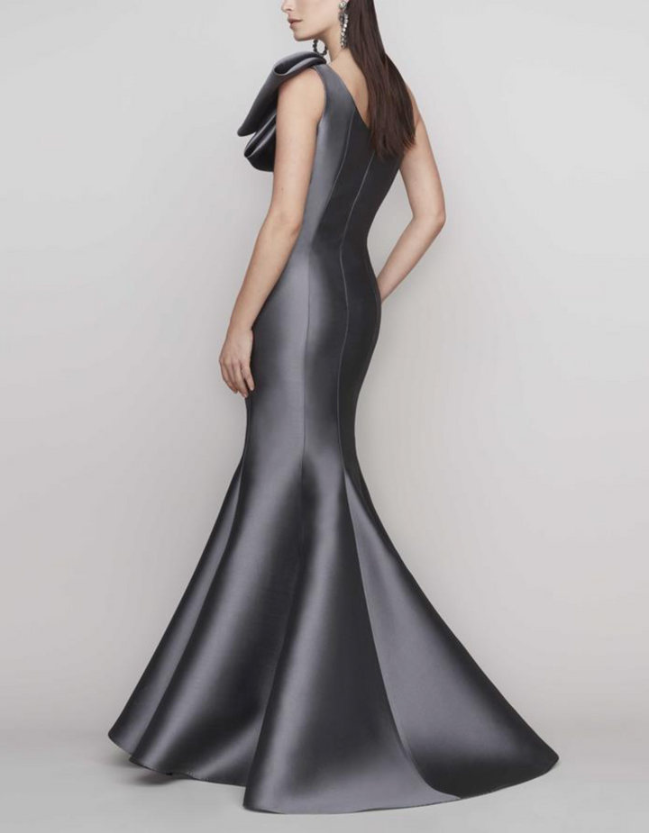 Graceful and refined, this one-shoulder satin gown in deep storm grey features a figure-enhancing mermaid silhouette. The structured bodice is adorned with a sculpted oversized bow at the shoulder, adding a bold, couture-inspired accent. Perfect for formal galas, black-tie events, or modern bridesmaids.