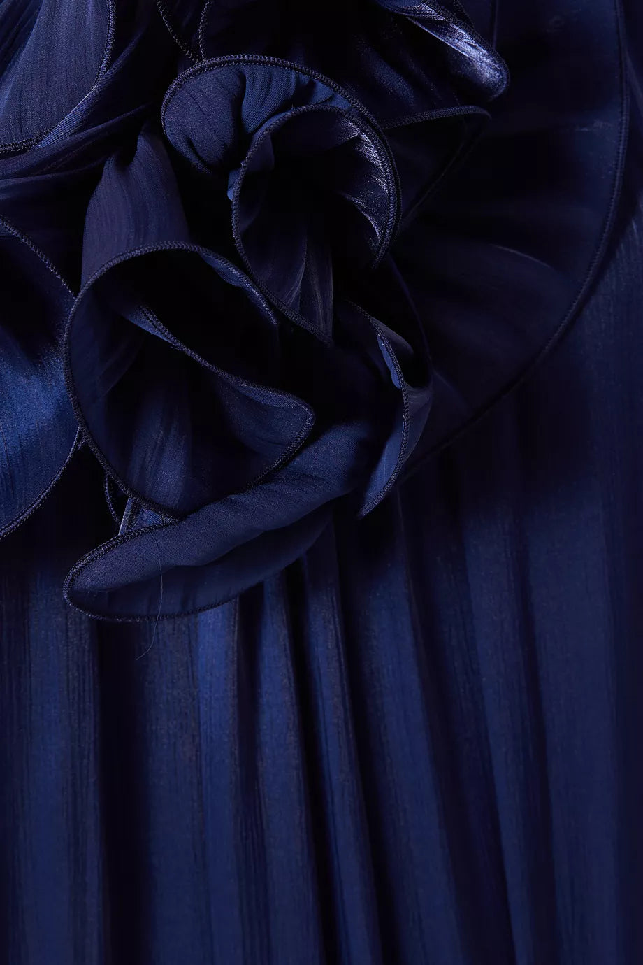 This navy one-shoulder gown features soft vertical pleats and a relaxed silhouette that flows elegantly to the floor. The statement-making floral appliqué at the neckline adds volume and a couture touch, creating a perfect balance between modern drama and timeless grace. Ideal for galas, receptions, or high-profile evenings.