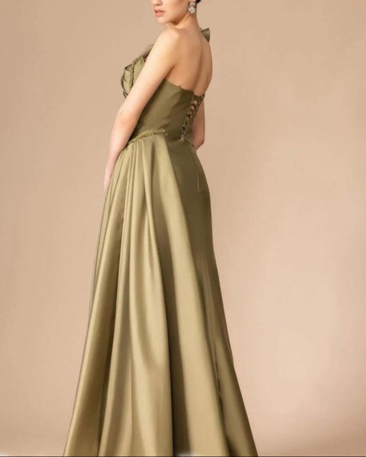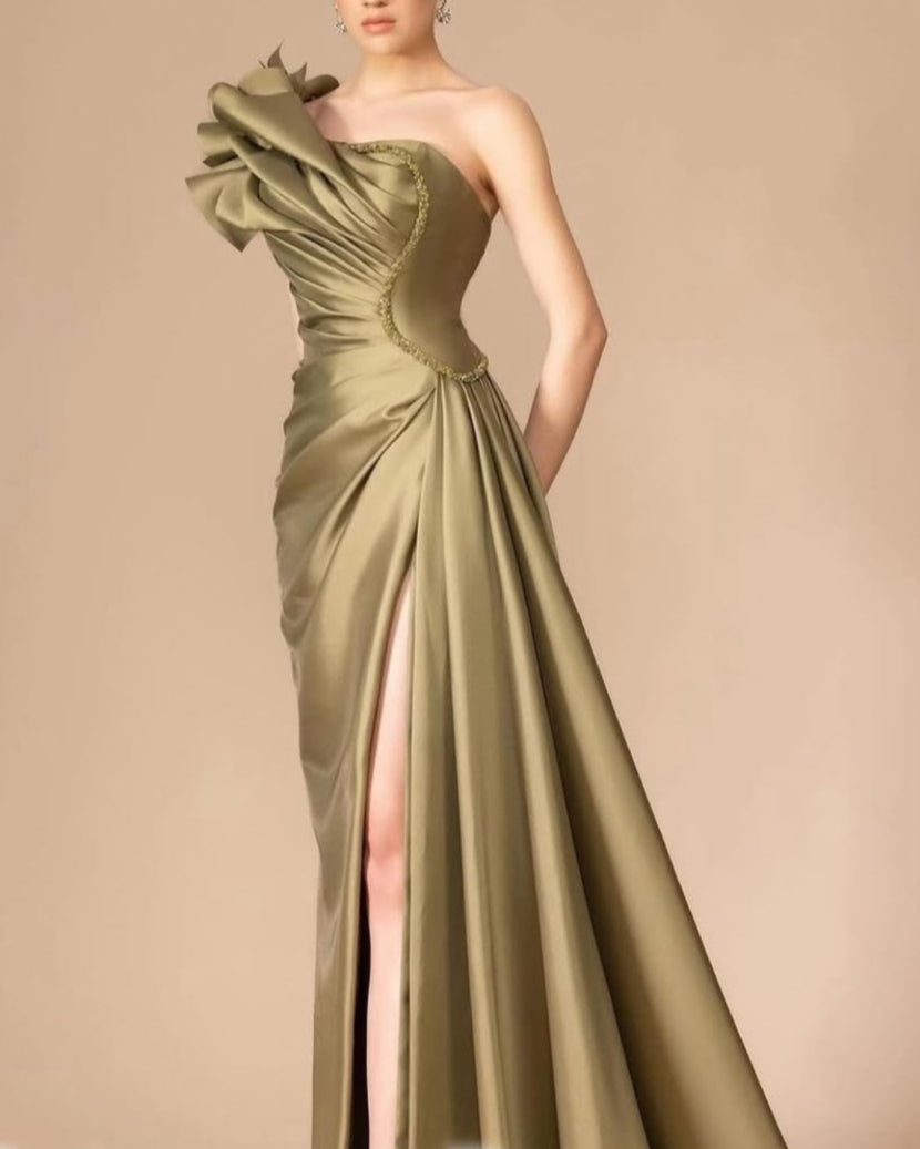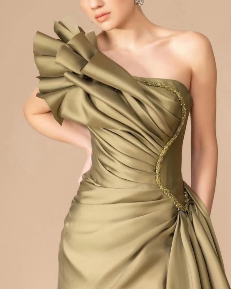 This luxe olive satin gown showcases a dramatic one-shoulder neckline with a sculpted ruffle detail and intricate beaded trim. The figure-hugging bodice flows into a gracefully draped skirt, finished with a daring thigh-high slit. A show-stopping look for galas, evening events, or red carpet occasions.