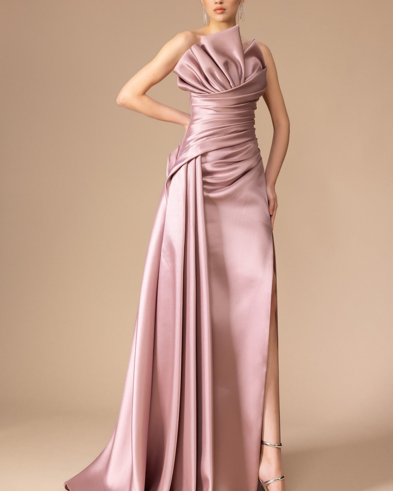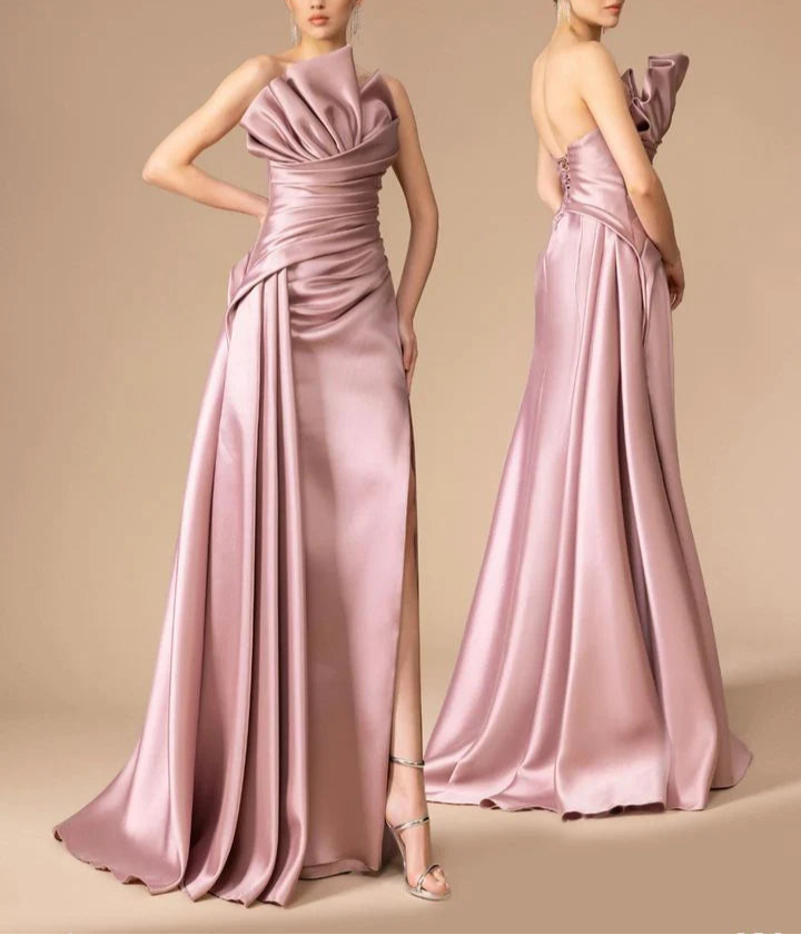 Radiate elegance in this lustrous mauve satin gown featuring a dramatic one-shoulder neckline with sculpted pleats. The ruched bodice enhances the silhouette, while a softly draped overlay flows into a high slit for a refined yet sensual finish. Ideal for galas, formal evenings, or weddings.