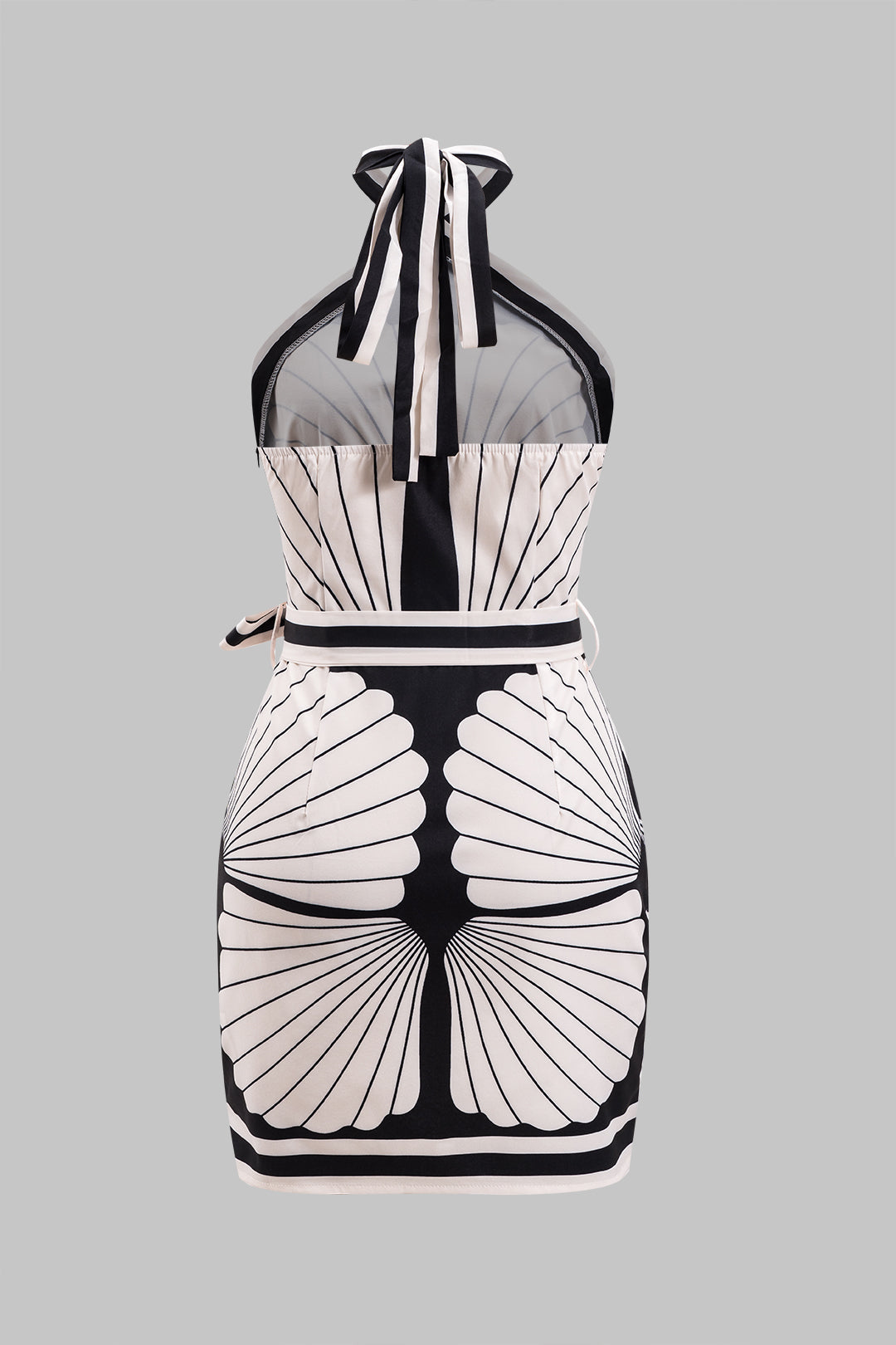 Abstract Floral Print Satin Ruched Halter Neck Strappy Backless Mini Dress