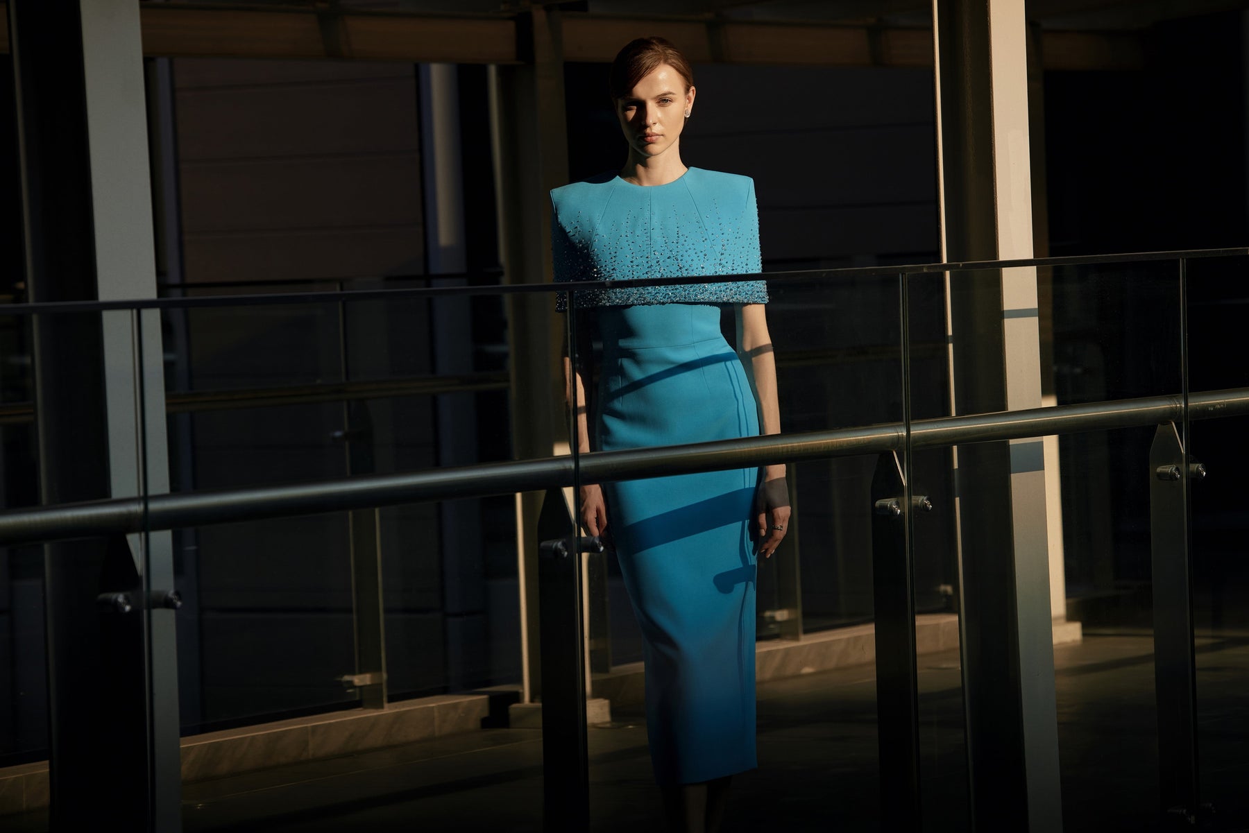 A striking azure midi dress with a sculpted silhouette, elevated by a structured cape overlay adorned with shimmering crystal embellishments—sleek, modern, and effortlessly glamorous.