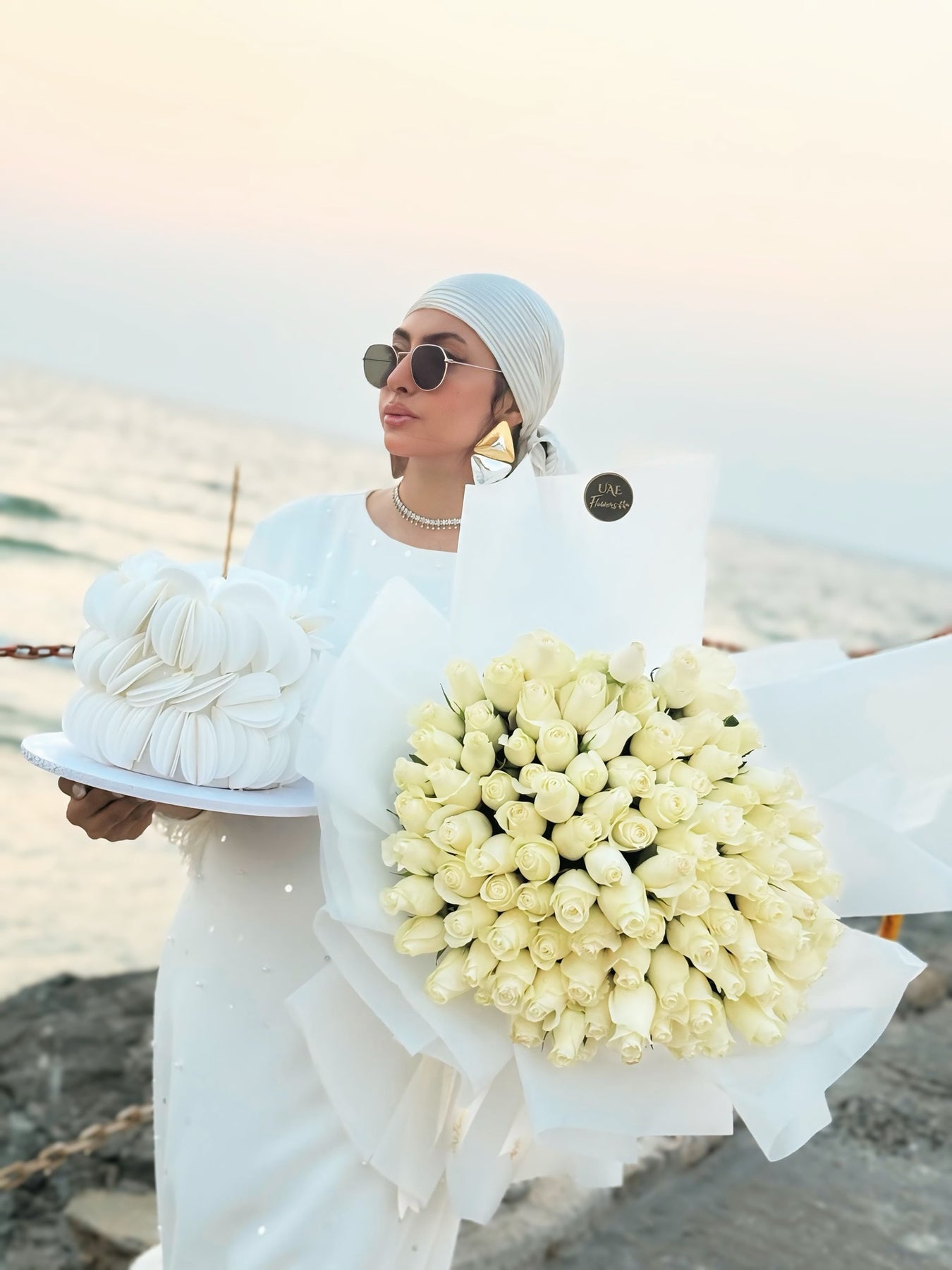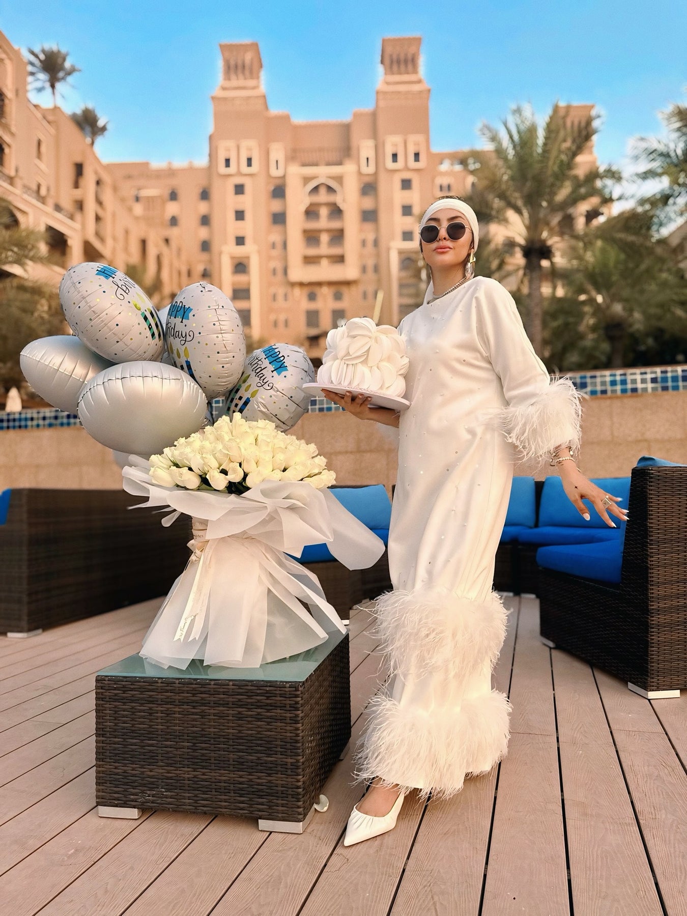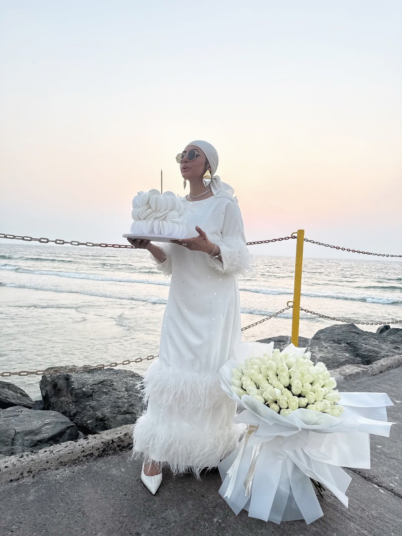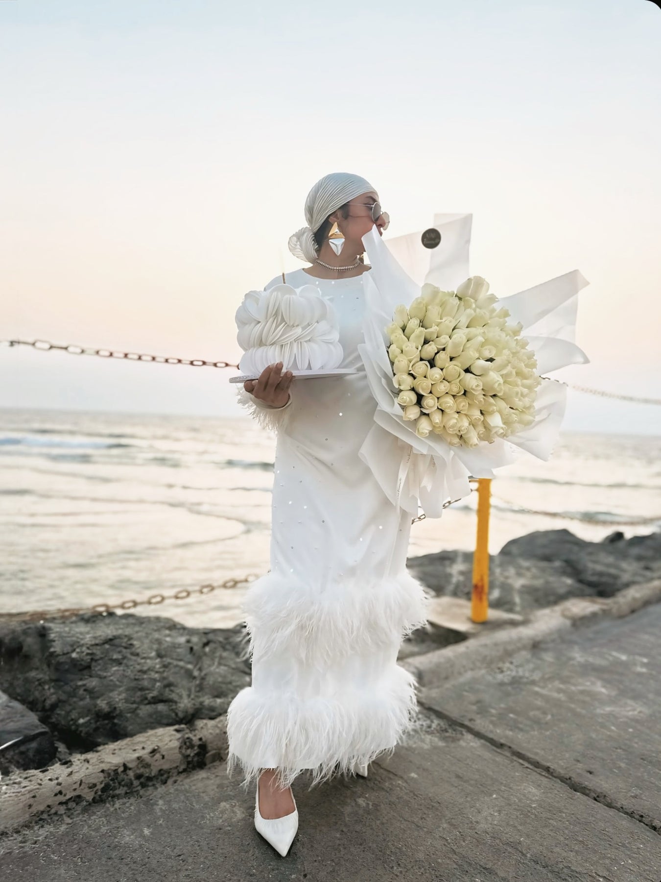 Luxurious ivory midi dress adorned with delicate crystal embellishments and lavish feather trims on the sleeves and hemline—an ethereal choice for refined soirées.