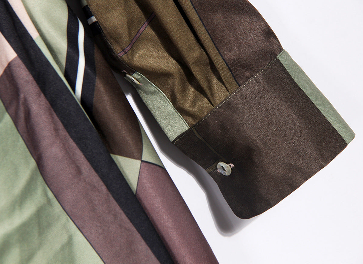 A distinctive shirt dress featuring a bold geometric print in earthy tones. Designed with a wrap front and an asymmetrical hem, this dress blends modern art-inspired patterns with simple elegance. Perfect for a chic look.