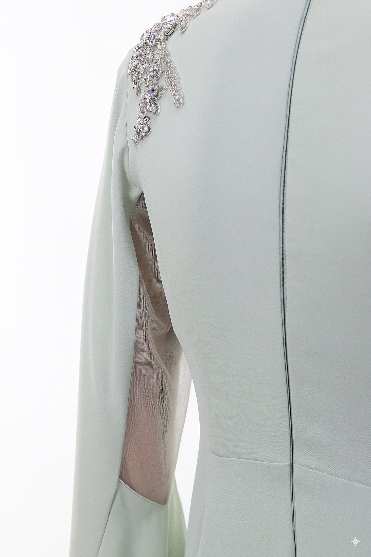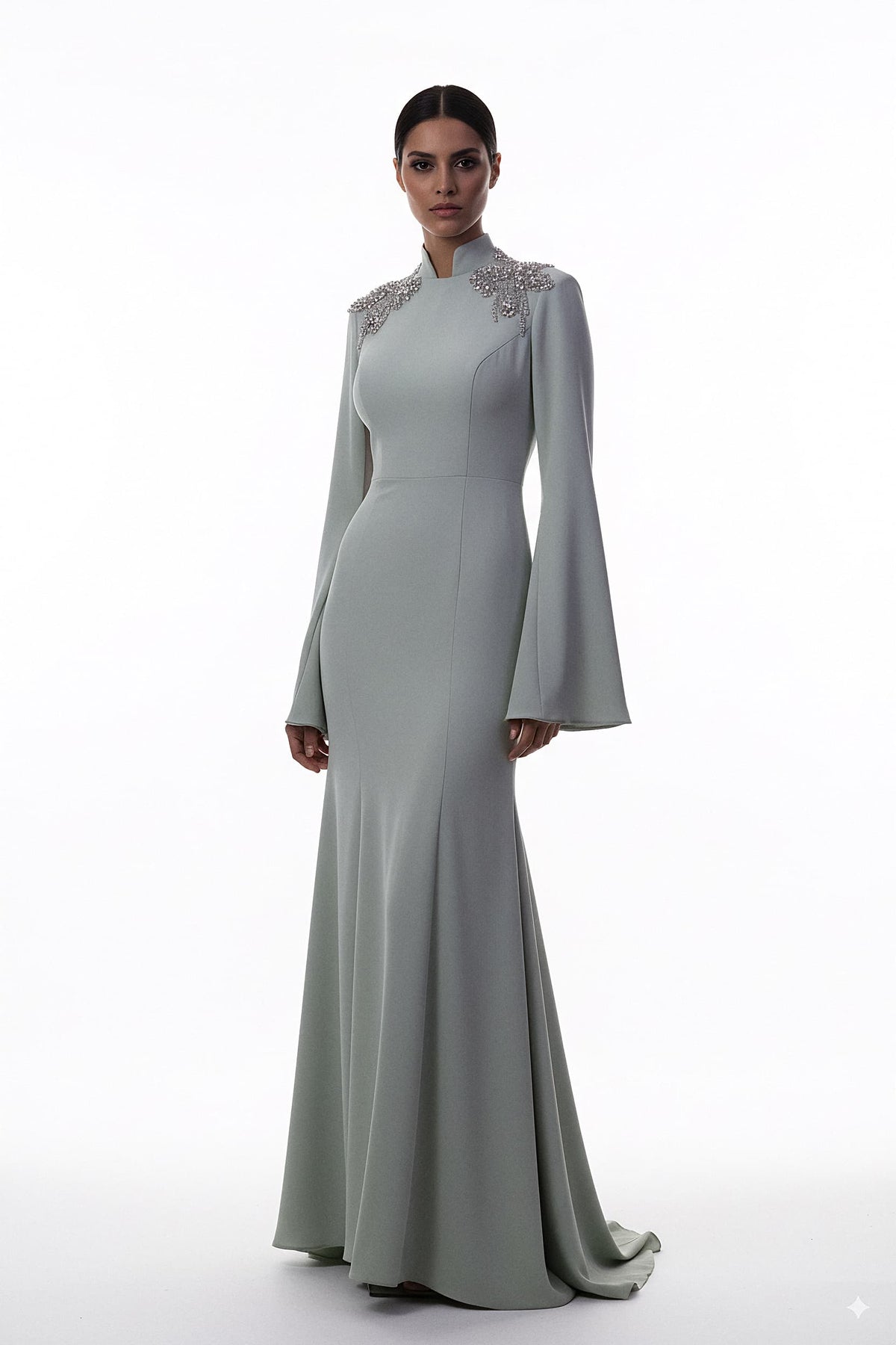 Elegant sage green gown featuring a high neckline, flowing bell sleeves, and a curve-enhancing mermaid silhouette. Adorned with delicate shoulder embellishments, it’s the perfect balance of sophistication and modern flair.