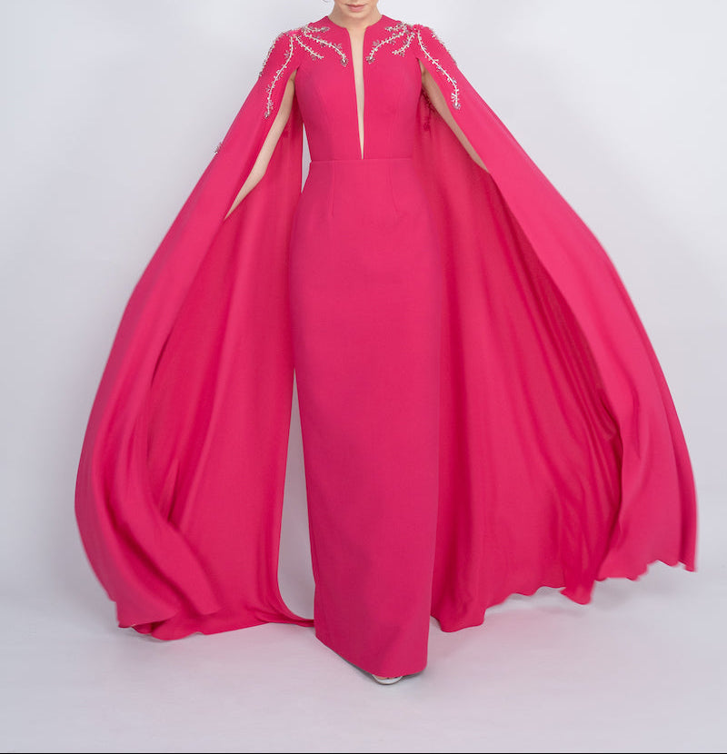 A luxurious red maxi gown featuring a fluid draped cape collar and sleek straight silhouette. Effortlessly elegant, this design blends modern minimalism with timeless glamour, perfect for evening galas or formal receptions.