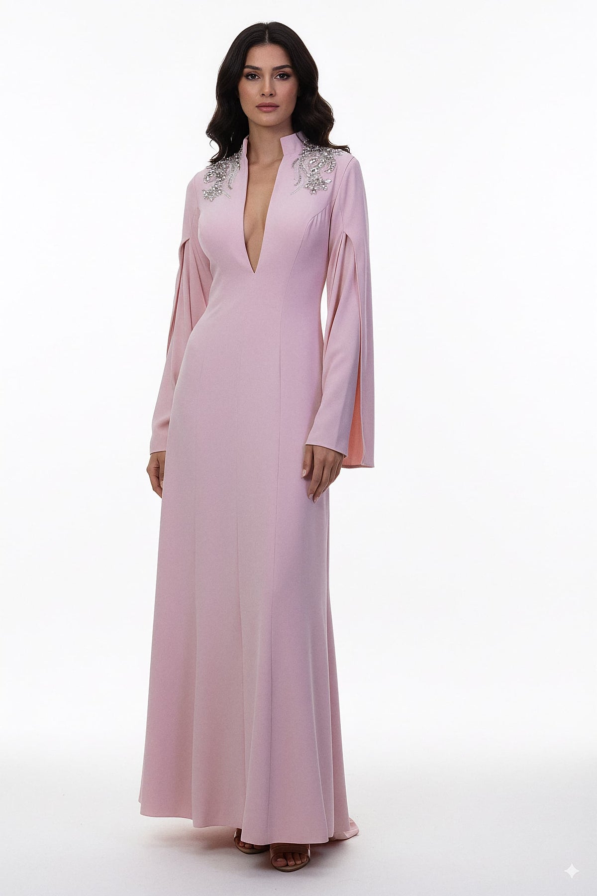 A soft blush pink gown featuring a daring plunging neckline, flowing slit sleeves, and delicate crystal-embellished shoulders. Its refined silhouette balances elegance with modern glamour, ideal for evening occasions.