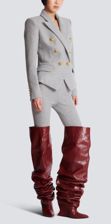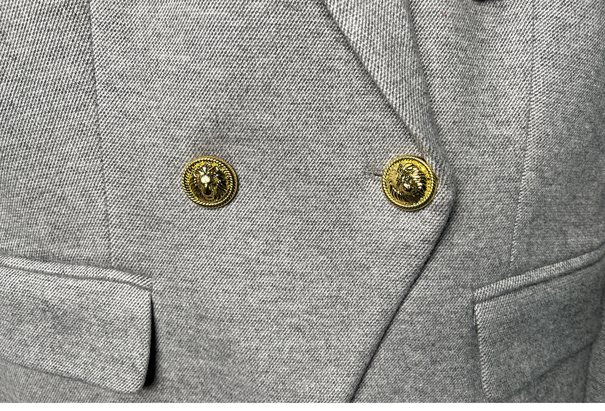 A refined double-breasted blazer crafted in a soft grey tone, featuring sharp tailoring and polished gold buttons for a powerful yet elegant finish. Designed to contour the waist and elevate everyday dressing, this piece blends modern sophistication with timeless structure.