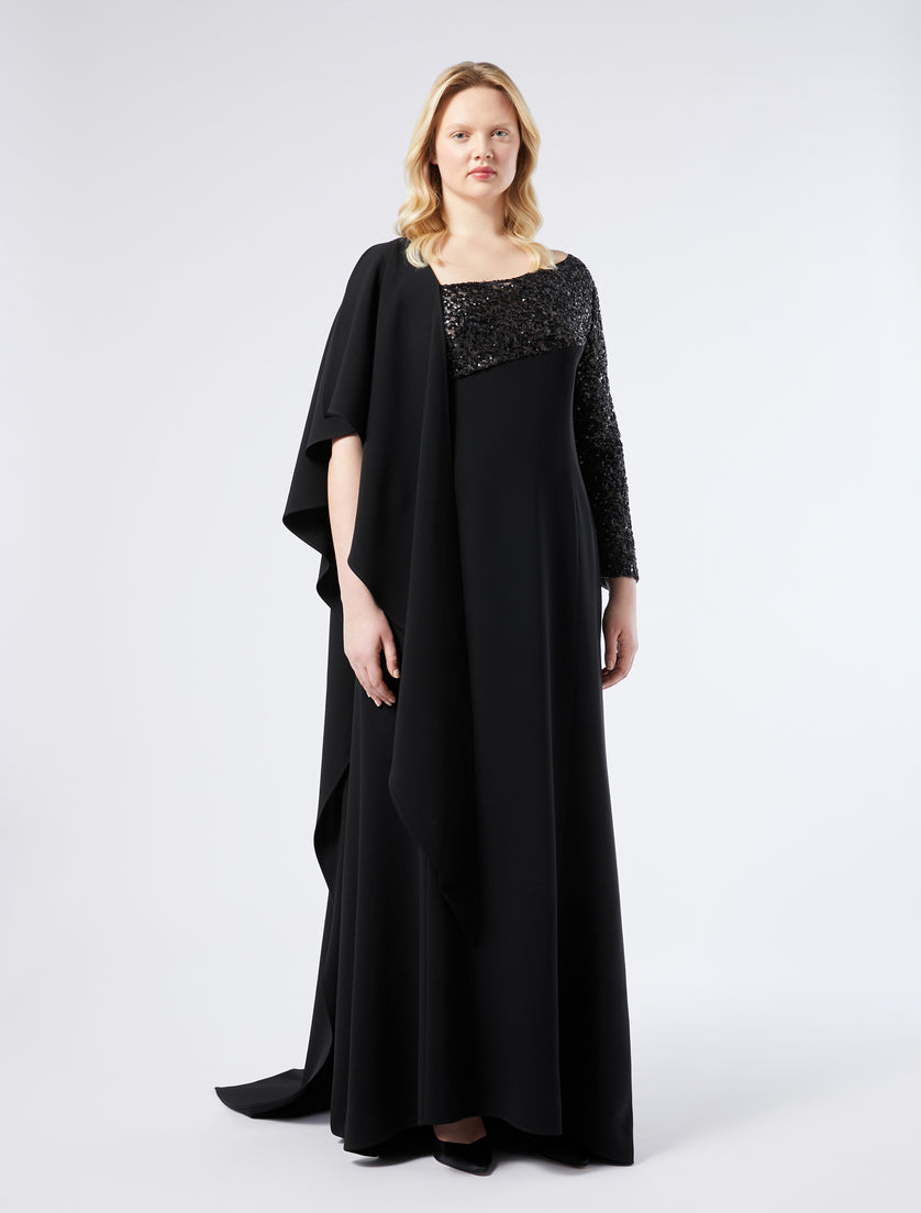 sequin-paneled gown with draped asymmetric cape – ELYANA