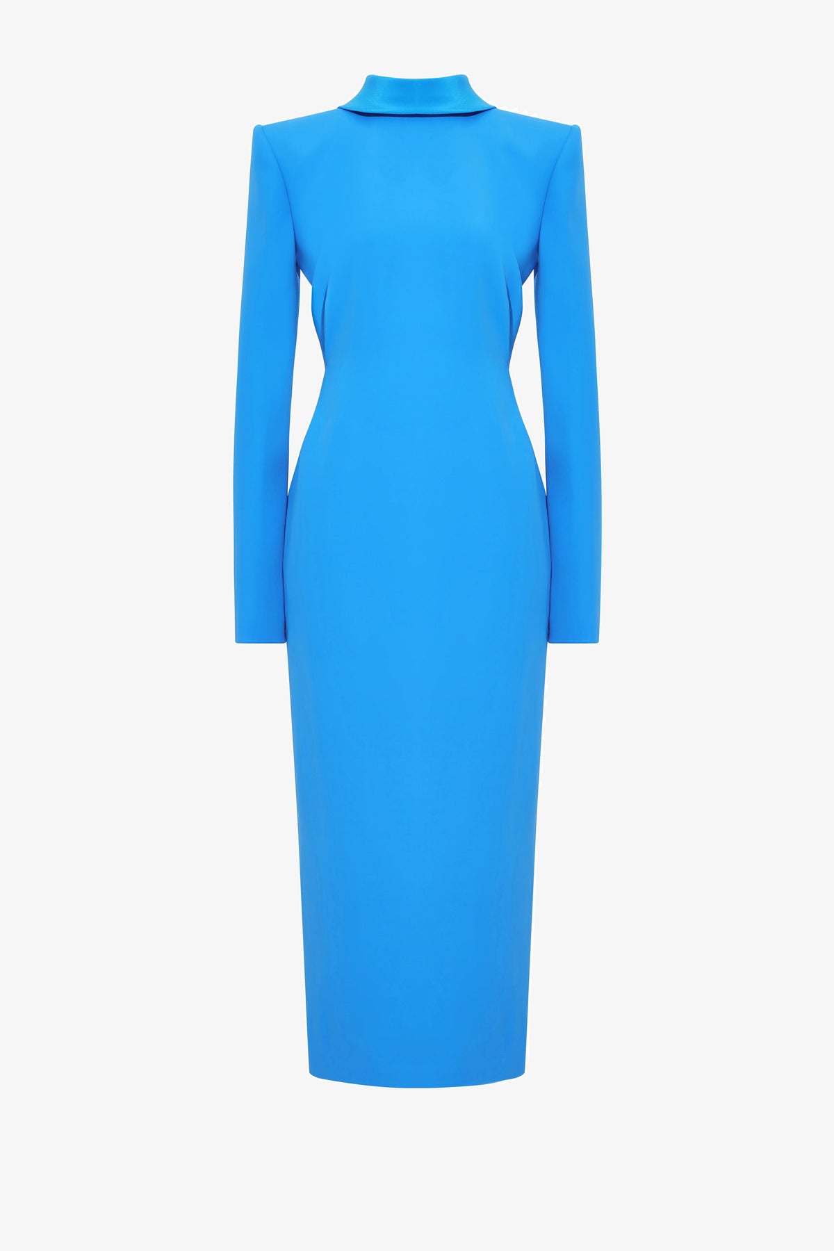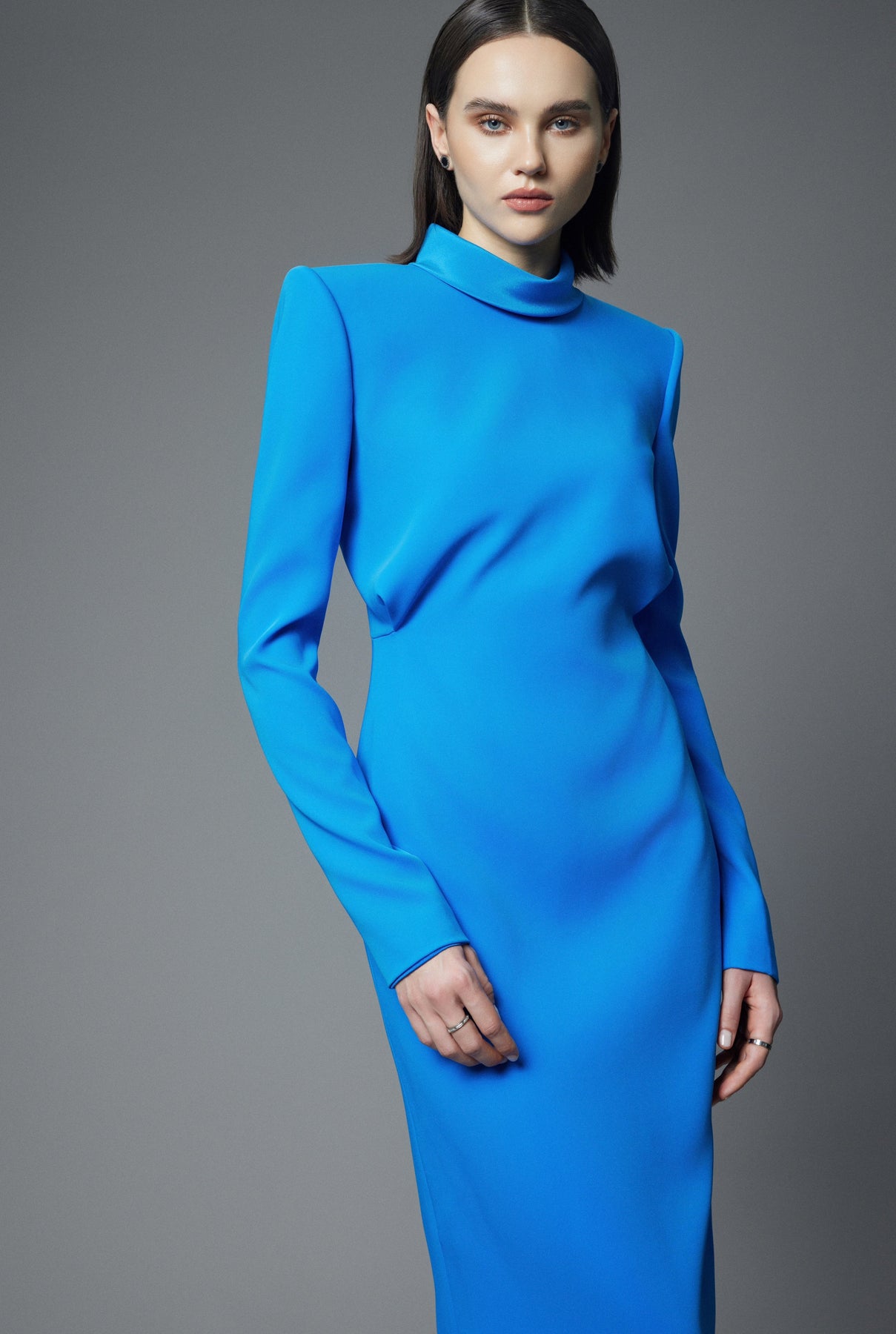 A striking electric-blue midi dress with a sleek high neckline, long sleeves, and a sculpted silhouette that exudes modern sophistication—minimalist yet powerfully elegant.